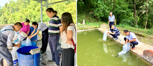 为确保此项产业的顺利落实,帮扶工作队制定了完备的工作方案。一是善用闲荒资源,全面摸查,研究两村可开发利用资源,实察鱼塘分布,确定培育水产养殖为新的增收点。二是尊重民情意愿,与塘主反复沟通对接,合理引导产业发展内生动力,确定出发展名单。三是科学制定方案,邀请市水产技术推广站专家李宏到村指导,逐塘实考,精准制定养殖方案。四是技术全程跟踪,邀请水产专家王仁泉等到良种基地指导鱼苗采购,把关质量,并到村现场示范放鱼,传授放鱼注意事项及鱼塘管理技术。五是明确权责边界,对于村集体经济增收鱼塘,提前确定管理人员及分利模式,明确责任范围。六是重视后期管理,建立应急预案,由工作队和村组干部定期回访,动态掌握养殖情况,确保年底增收。(市农科院、市农业项目服务中心)