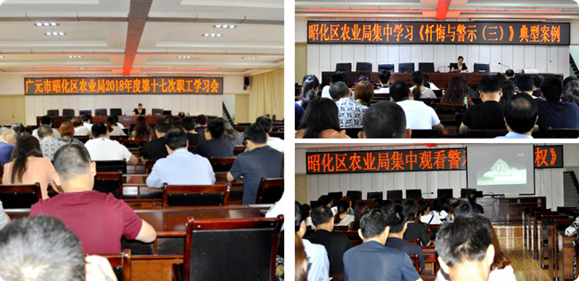 近日,昭化区农业局召开了第十七次全体职工会议。会议学习了昭纪发【2018】21号《关于四起扶贫领域违纪问题典型案件的通报》文件精神,观看了《权》-杨海违纪案件、《忏悔与警示(三)》市区两例涉及钱权交易违纪案件。通过观看,使全体党员干部深受教育,纷纷表示要以此为警示,管住自己的嘴,手莫伸,特别是涉及农业项目、产业发展资金的同志将把防腐牢牢刻在心中,深化“三同”机制,努力营造风清气正的干事环境。局纪检组长朱芙蓉主持了会议。