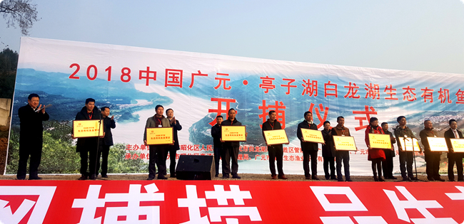 1月12日, 2018中国广元•亭子湖白龙湖生态有机鱼捕捞仪式在广元市昭化区虎跳码头举行。这是广元市首次进行巨网捕捞活动,标志着“两湖”生态渔业进入全面运营阶段。