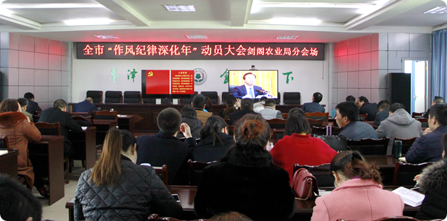 2月22日下午,春节后上班第一天,广元市召开作风纪律深化年电视电话动员大会,剑阁县农业局精心准备,认真组织,局领导班子及全体职工108人参加会议。