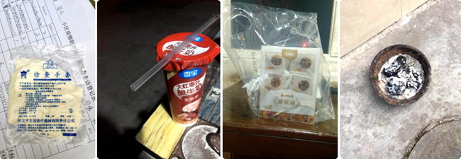 南元小区群众送给突击队员的医用手套、酸奶、面包、炭火