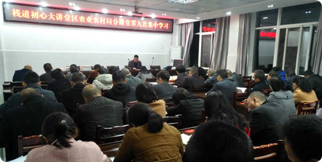11月18日,广元市朝天区农业农村局认真开展“栈道初心”大讲堂第九次集中学习。集中学习了《习近平新时代中国特色社会主义思想学习纲要--将全面深化改革进行到底》《习近平关于“不忘初心、牢记使命”论述摘编》《党员榜样:张贵平》,观看警示教育片《交易中心的“蛀虫”》。围绕“全面擦亮朝天农业金字招牌”主题,开展集中讨论,全体干部职工积极踊跃发言。