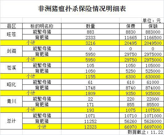 截止11月22日,全市已在苍溪县、旺苍县、剑阁县、昭化区、青川县全面开展非洲猪瘟保险工作。现已承保能繁母猪1071头、育肥猪11252头,保额669.7万元。朝天区和利州区正在宣传对接中。