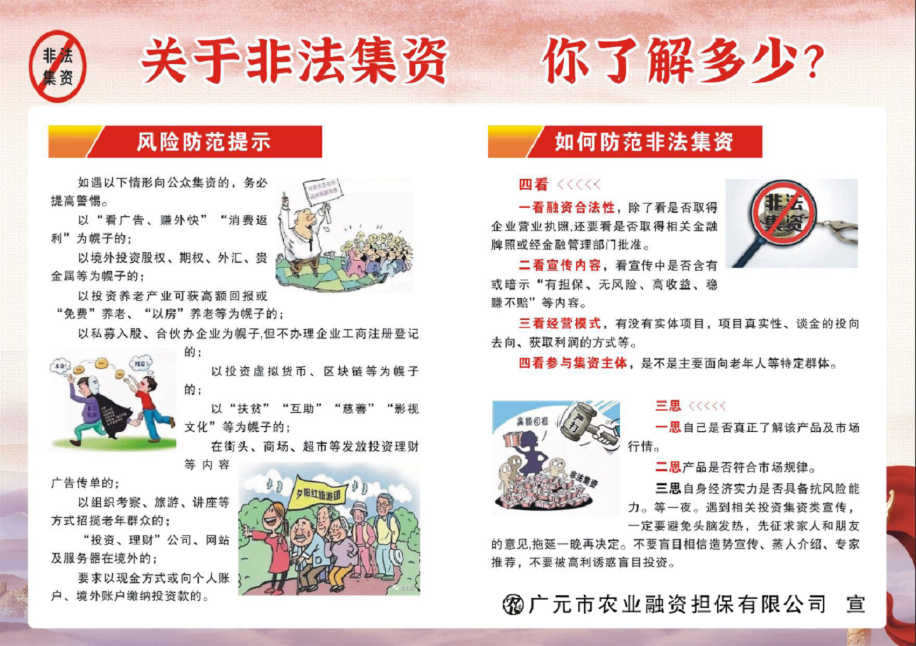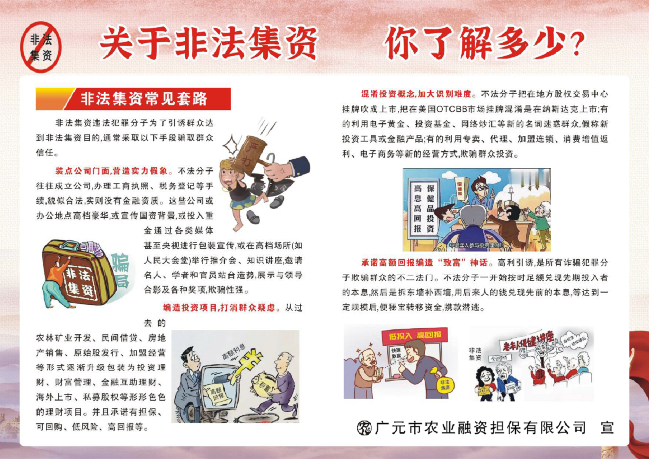 为提高公司全体职工以及广大“三农”经营主体识别、抵制非法集资能力,引导大家自觉远离非法集资陷阱,连日来,市农担公司多形式、多渠道开展“防范非法集资”宣传活动。