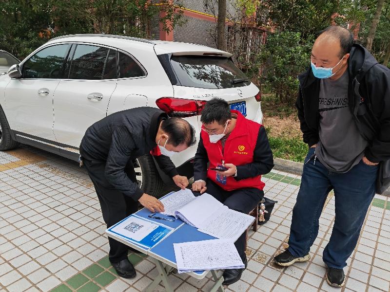 市财政局党员志愿者在金泽苑小区开展值班值守、“敲门行动”等工作。