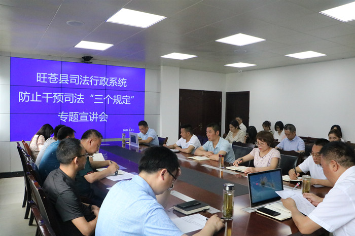 同时,根据旺苍县政法队伍教育整顿领导小组办公室安排部署,在全县党政机关开展防止干预司法“三个规定”宣讲,6月11日下午,旺苍县司法局党组书记、局长王大中到第五组开展防止干预司法“三个规定”宣讲。