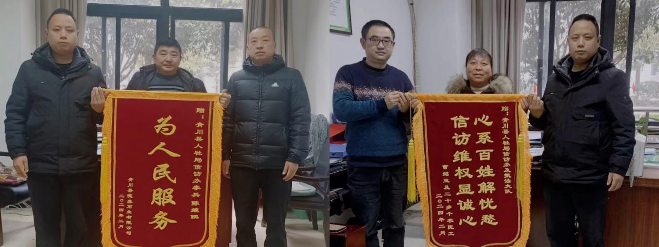 2024年2月,两名农民工代表为青川县人社局劳动监察综合行政执法大队送锦旗,感谢县人社局为50余名农民工追回被拖欠工资17.8万元。