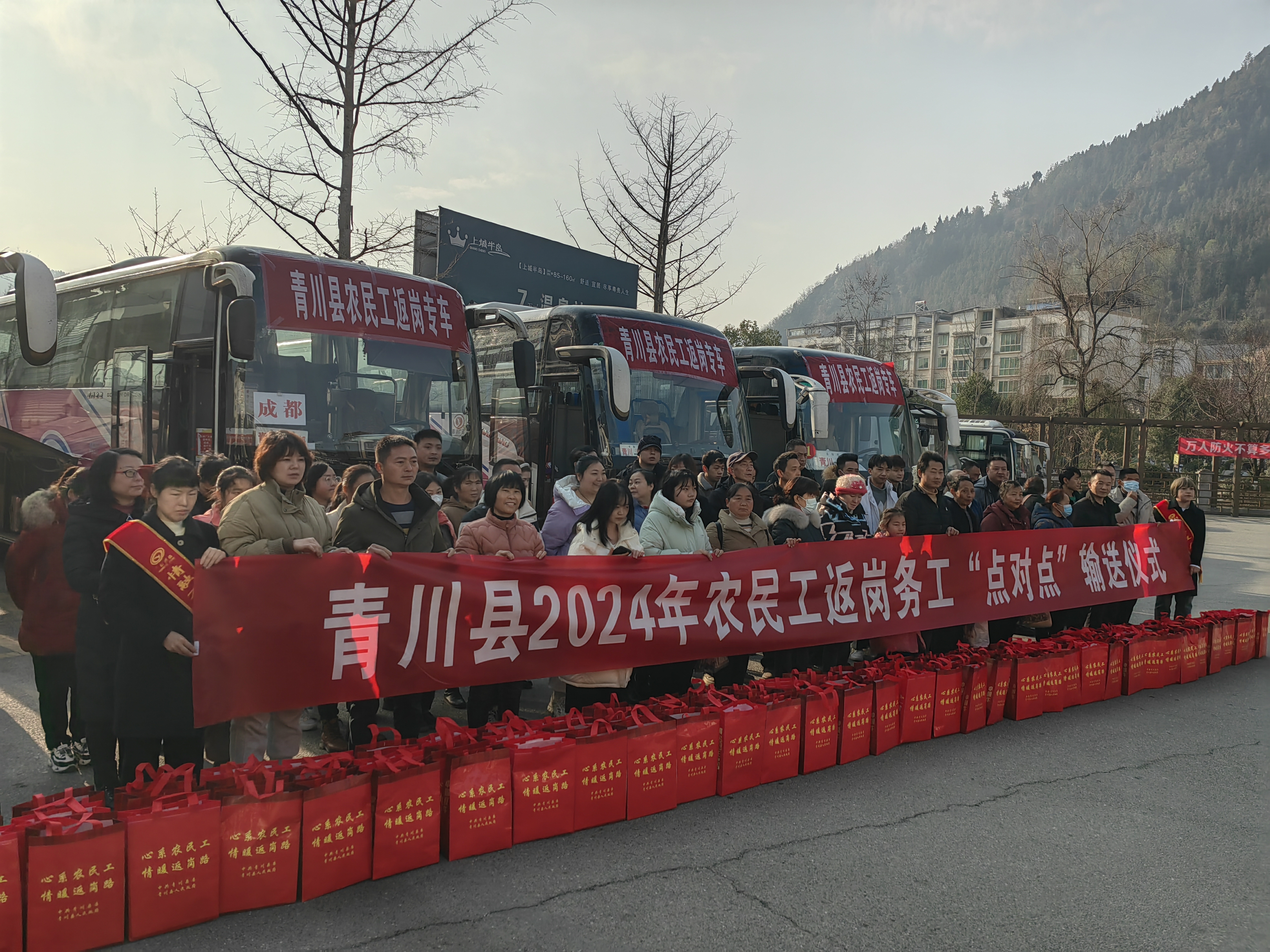 2024年2月13日(农历正月初四)上午10点,青川县人社局2024年农民工返岗务工“点对点”专车输送首发仪式在青川县客运中心隆重举行,4辆首批免费返岗专车正式启程,承载着120名返乡农民工赴成都、绵阳务工。