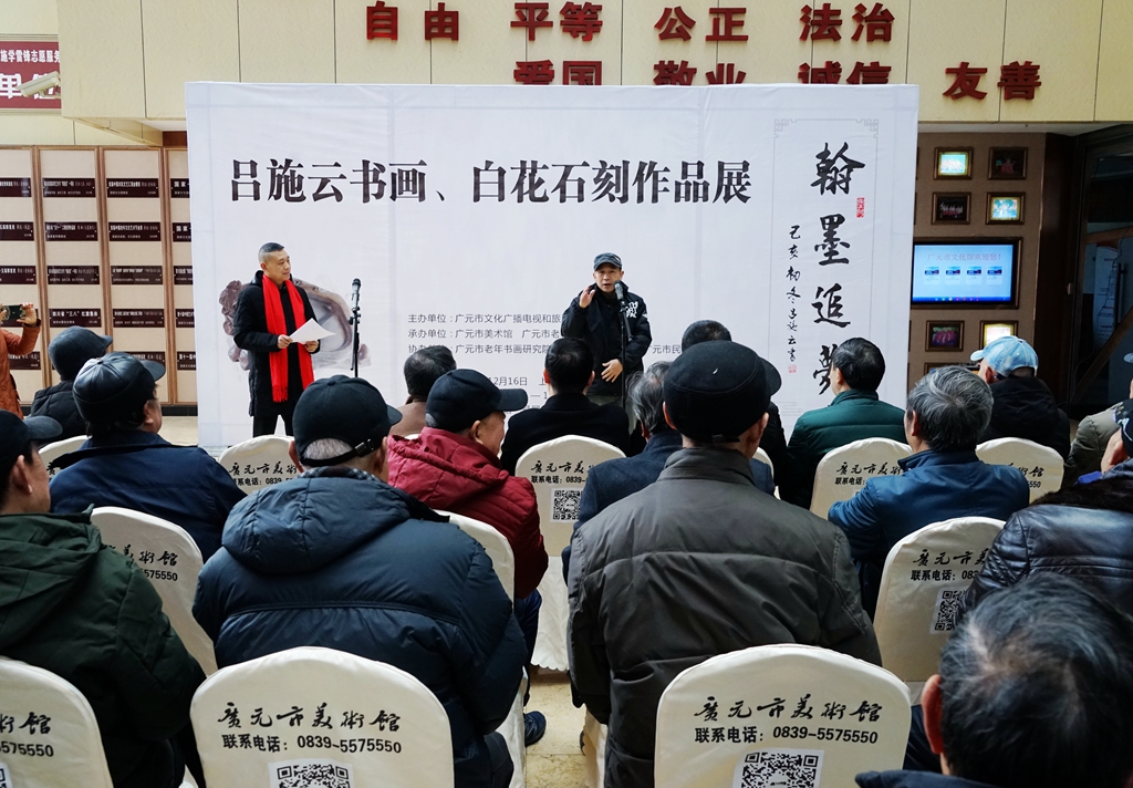 12月16日上午,由广元市文化广播电视和旅游局主办,广元市美术馆、广元市老科学技术工作者协会承办,广元市老年书画研究院、广元市美术家协会、广元市民间文艺家协会协办的翰墨追梦——吕施云书画、白花石刻作品展在广元市美术馆开展。市文化广播电视和旅游局副局长李子林、市文化广播电视和旅游局党组成员俞天喜,市台办原主任、老科协副会长兼秘书长任文刚,市文联副主席、市美术家协会主席赵勇以及市美术馆、市老科协、市美协、市老年书画研究院、市民间文艺家协会等相关单位负责人和书画爱好者出席了开展仪式。