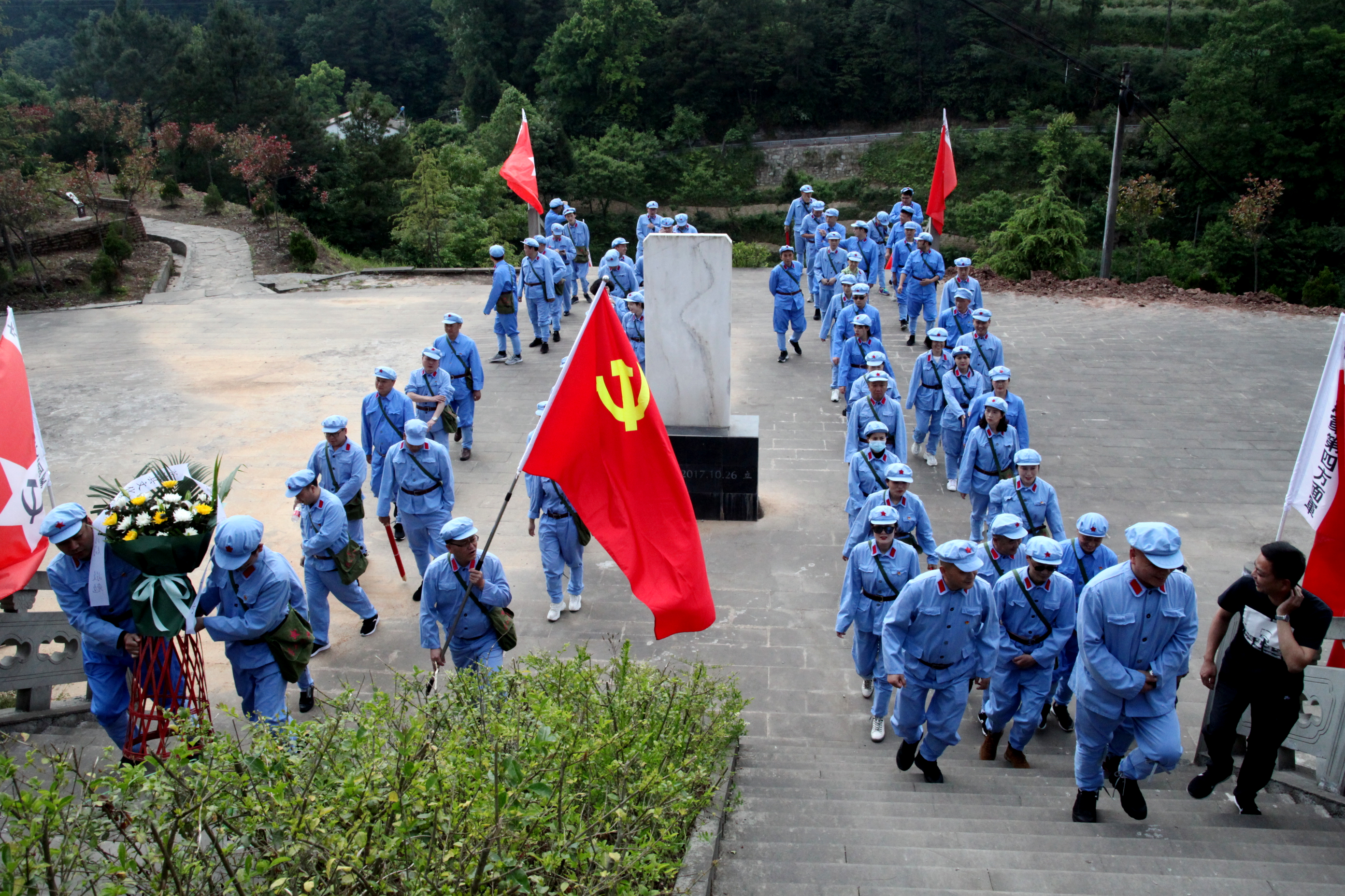 5月7日午后,烈日当空,黄猫垭上映山红花开正艳。全体党员干部身着红军服,排着整齐的队伍,在鲜红的党旗引领下步入黄猫垭革命烈士陵园,开展“缅怀革命先烈,传承红色基因”现场教学。在9.15米高的黄猫垭革命烈士纪念碑下,全体人员整队肃立,氛围庄严肃穆,认真聆听了《黄猫垭战役》微党课,向纪念碑敬献花篮,向革命烈士默哀,面对纪念碑重温入党誓词;全体人员列队瞻仰纪念碑,缓缓走过原国家主席李先念骨灰撒放区和烈士陵园;接着,先后参观了弹痕松、黄猫垭战役指挥所等黄猫垭战役遗址遗迹。