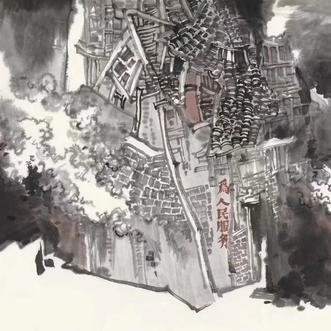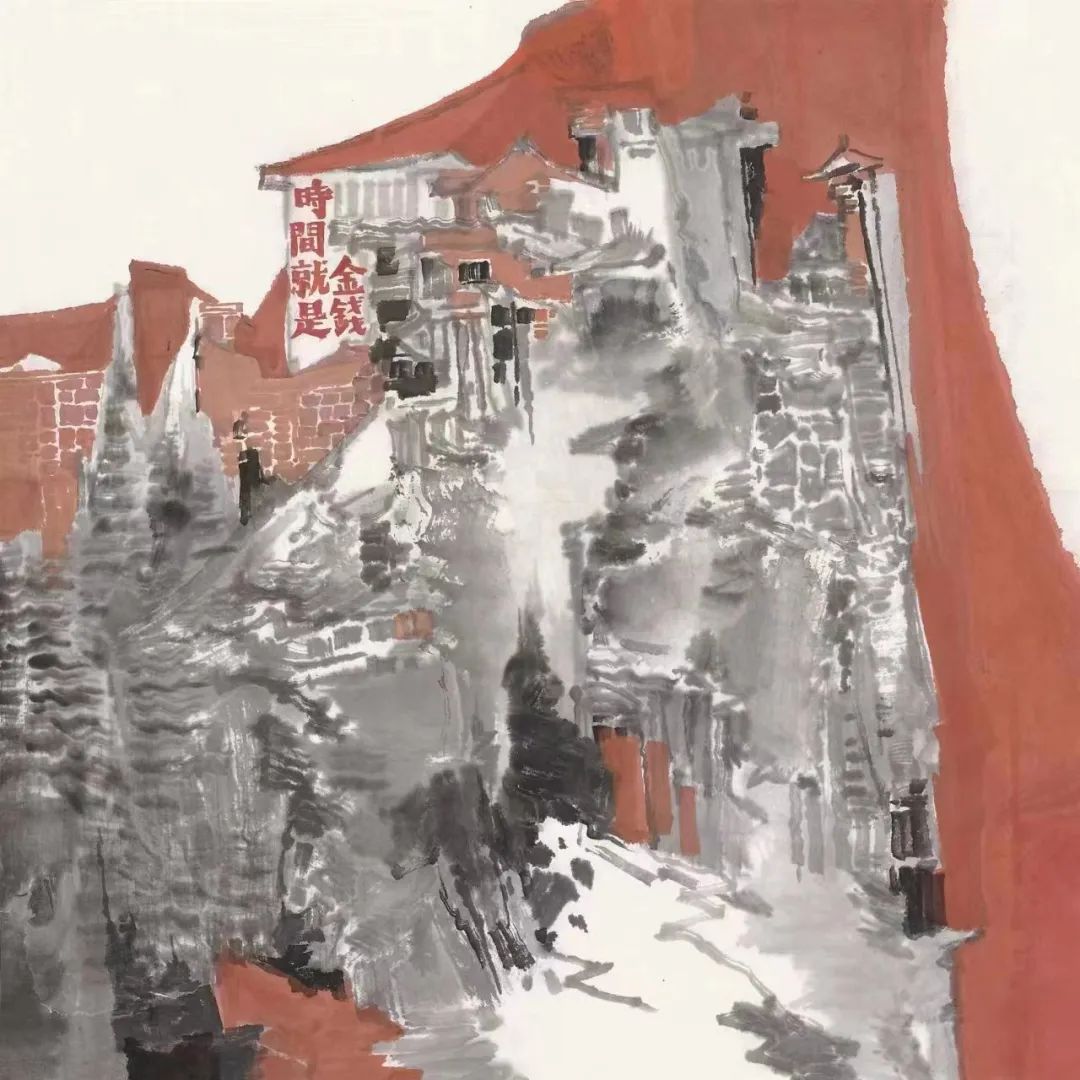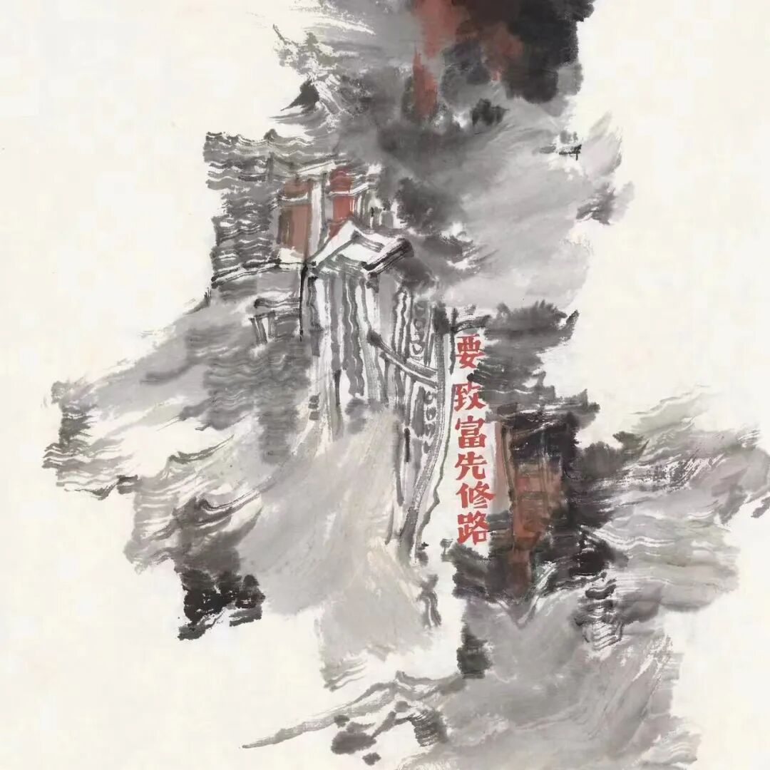 这批作品,叙述着作者的情怀。该批作品以广元老昭化“老房子”为景入手,讲述着历史的变迁。张剑比我小几岁,都经历了从上世纪八九十年代到现代社会的历史变迁,体现了社会历史发展的“叙事”。《农业学大寨》、《葭萌供销社》、《时间就是金钱》、《只生一个好》、《要致富先修路》等作品,张剑用独特的视角,回忆了上世纪70、80、90年代中国社会的变化。作品中的“老房子”今已不复存在,而画中的“老房子”,也许只是其心中难以忘怀的“广元印象”。近年来,张剑多幅作品入选中国美协主办的展览,体现了其审美趣味的不俗。这批作品,从房子的“一角”入手,以小见大。画面空白处理得当,“计白当黑”的构图观可展现“意境”。清张式谓:“空白非空纸,空白即画也。” 自宋以降,水墨画大胆运用空白,使画面空灵而清净。文人画中如“减笔法”、“泼墨法”、“一角半边”画法,表现出来清高的格调,正如笪重光《画筌》所说“虚实相生,无画处皆成妙境”。这批作品具有现代“形式感”,与传统“三远”的构图造型有着明显区别,这也正是当代中国画创作的一个方向。不得不说,这批作品用色非常“小心”,赭石、朱磦施以淡墨,体现了一个“雅”字。《要致富先修路》寥寥数笔,更是体现了作者不俗的创作功力。