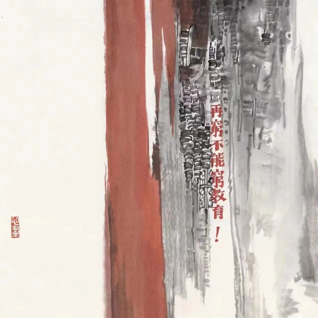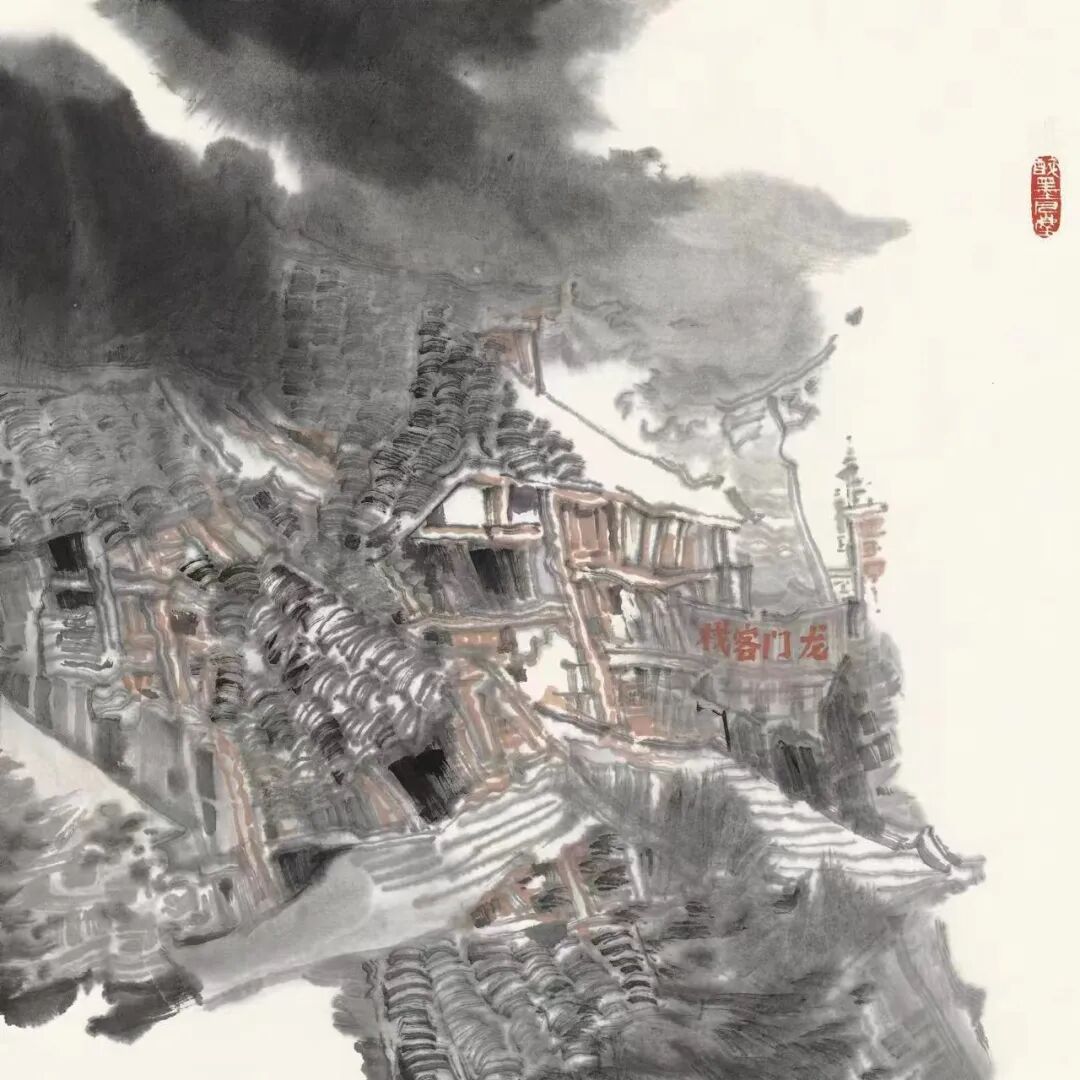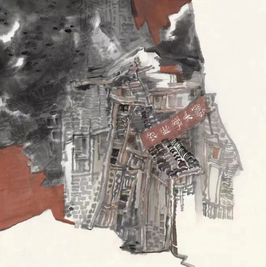 这批作品,叙述着作者的情怀。该批作品以广元老昭化“老房子”为景入手,讲述着历史的变迁。张剑比我小几岁,都经历了从上世纪八九十年代到现代社会的历史变迁,体现了社会历史发展的“叙事”。《农业学大寨》、《葭萌供销社》、《时间就是金钱》、《只生一个好》、《要致富先修路》等作品,张剑用独特的视角,回忆了上世纪70、80、90年代中国社会的变化。作品中的“老房子”今已不复存在,而画中的“老房子”,也许只是其心中难以忘怀的“广元印象”。近年来,张剑多幅作品入选中国美协主办的展览,体现了其审美趣味的不俗。这批作品,从房子的“一角”入手,以小见大。画面空白处理得当,“计白当黑”的构图观可展现“意境”。清张式谓:“空白非空纸,空白即画也。” 自宋以降,水墨画大胆运用空白,使画面空灵而清净。文人画中如“减笔法”、“泼墨法”、“一角半边”画法,表现出来清高的格调,正如笪重光《画筌》所说“虚实相生,无画处皆成妙境”。这批作品具有现代“形式感”,与传统“三远”的构图造型有着明显区别,这也正是当代中国画创作的一个方向。不得不说,这批作品用色非常“小心”,赭石、朱磦施以淡墨,体现了一个“雅”字。《要致富先修路》寥寥数笔,更是体现了作者不俗的创作功力。