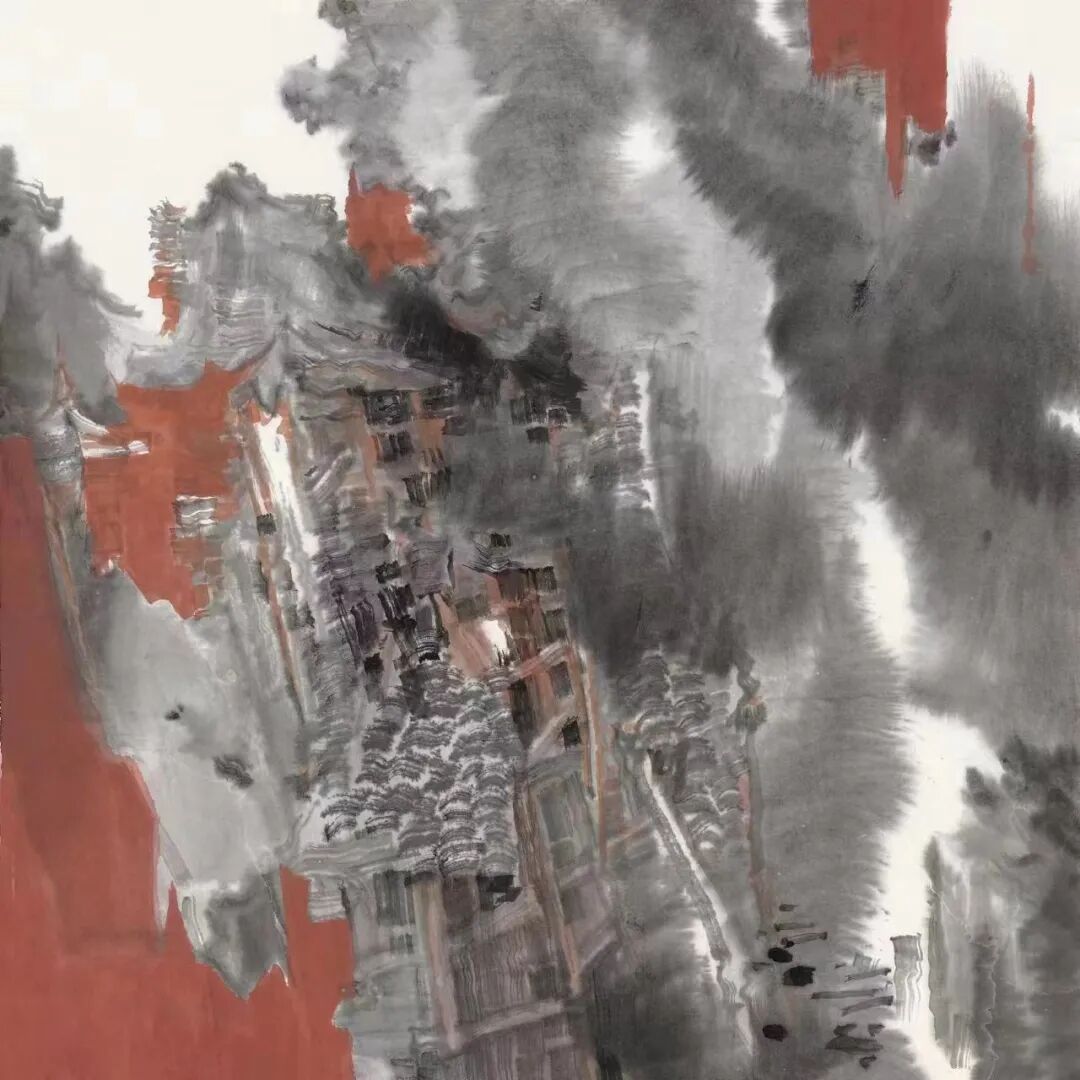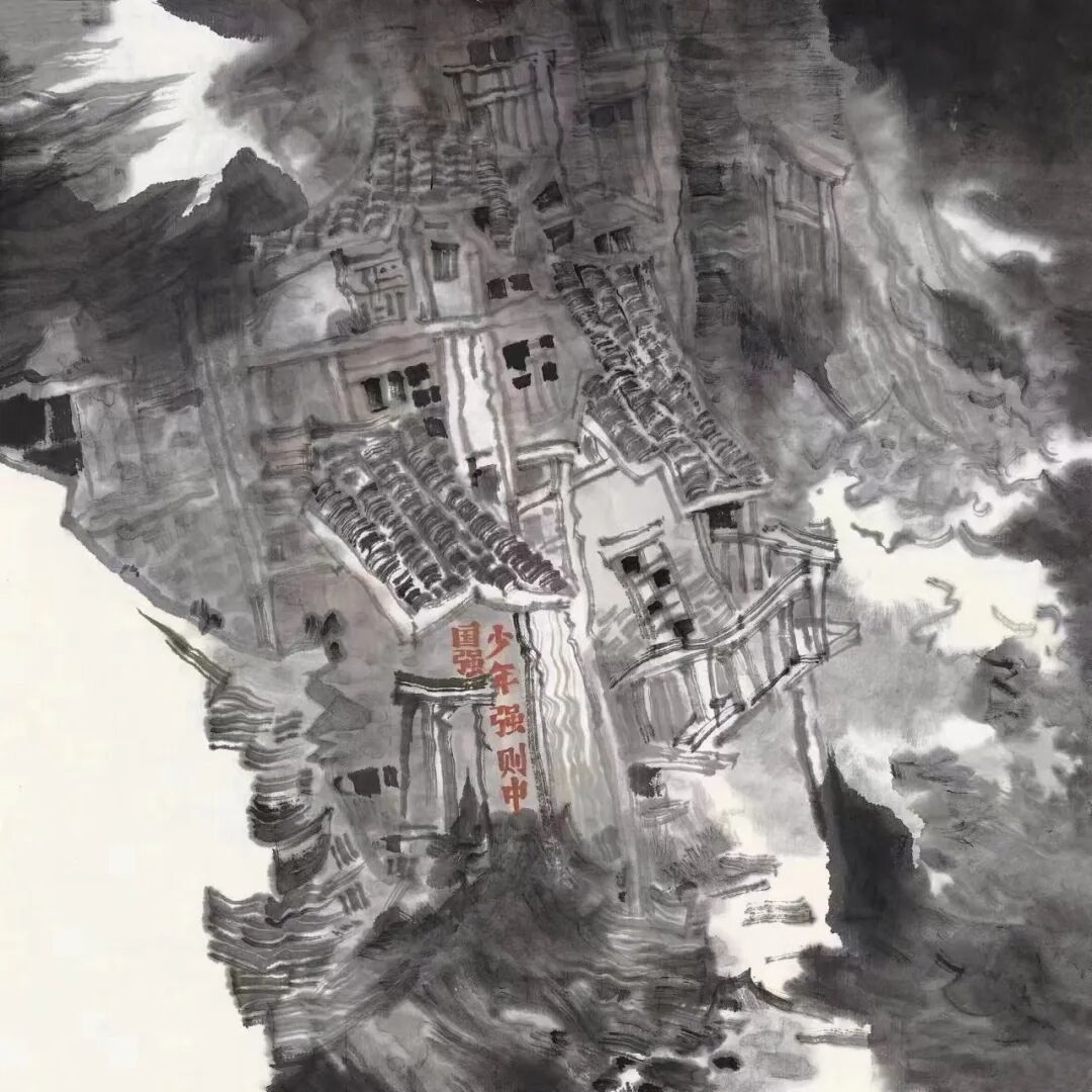 这批作品,体现了其用墨的韵味。笔墨,是中国画的灵魂。但凡学习中国画的人,其一生都在对“笔墨”进行锤炼。“墨”作为中国书画艺术的物质媒介,历来受到书画家高度重视。《山水松石格》谓“格高思逸、笔妙墨精”,可见古人对用墨的重视。而近代黄宾虹先生用墨“浑厚华滋”,则体现的是一种民族精神。可以看出,张剑的这批作品,用墨“润活有度”。作品《少年强则中国强》,利用了生宣纸的性能,巧妙地用水、用色,画面墨色层次丰富,变化多端,整体感觉黑中透亮。特别是暗部的用墨,非常小心。董其昌在《画禅室随笔》谓:“用墨需使有润,不可使其枯燥”。而张剑在处理大面积泼墨时,暗处巧妙留白,亮处绝不复笔,这也是其多年经验所得。另外,张剑的作品,体现了淡墨与用水技巧。杜甫有诗云:“元气淋漓障犹湿”,淡墨的使用更能表达书画的“气韵”。这批作品,用墨“虚”与“实”结合,传统用墨中透着浓厚的“现代感”,通过笔墨的“虚实相生”,求其“韵”,也是近年来张剑的成功之处。