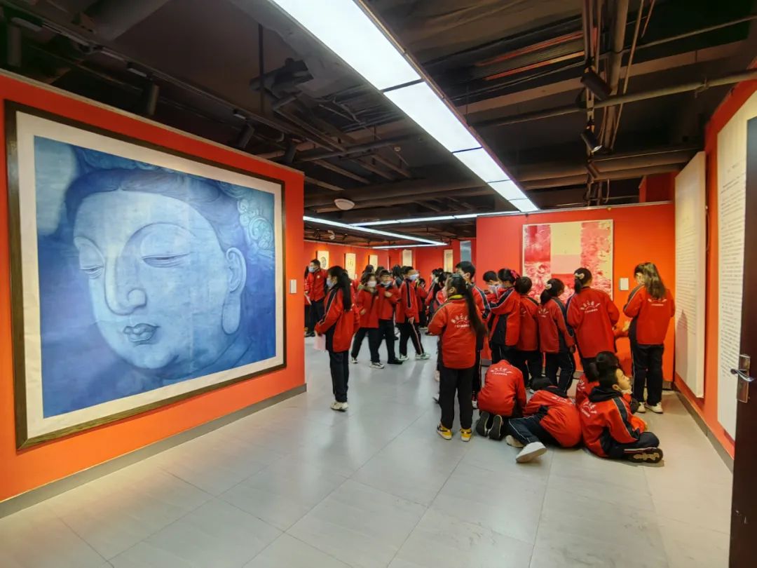 美术馆展厅里,《嘤鸣蜀道——苏茂隆水墨艺术展》以明媚雅致的色调,挺劲柔韧的线条吸引了孩子们追寻艺术、探索世界的目光。庄严慈悲的佛像、剑胆琴心的仕女、抽象前卫的绿马,将孩子们带到一个天马行空、如梦似幻的艺术世界,那一幅幅浓墨重彩的画作也将美的种子植入了少年们心中。