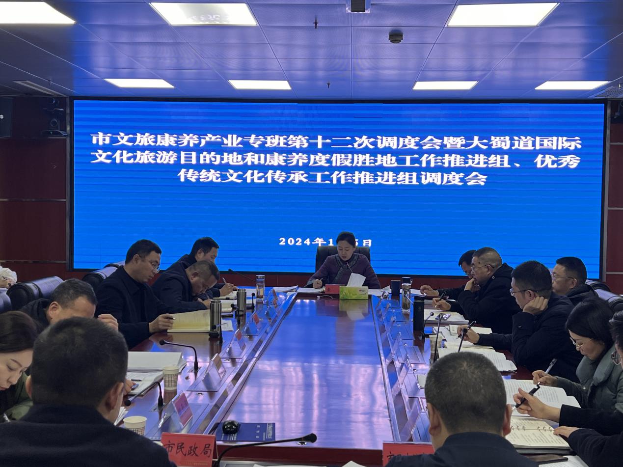 1月5日,市文旅康养产业专班第十二次调度会暨大蜀道国际文化旅游目的地和康养度假胜地建设工作推进组、优秀传统文化传承工作推进组调度会在市传媒中心召开。市委常委、宣传部部长、市文旅康养产业专班班长、大蜀道国际文化旅游目的地和康养度假胜地建设工作推进组、优秀传统文化传承工作推进组袁敏出席会议并讲话,市政协副主席、市文旅康养产业专班副班长李豪主持会议。