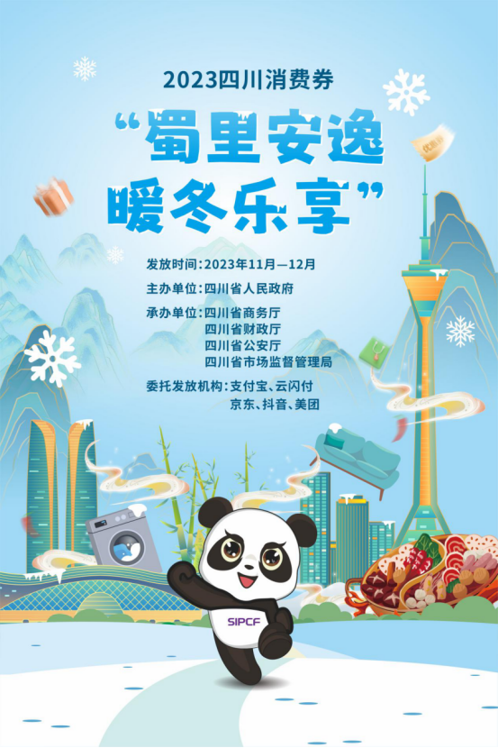 为贯彻落实《四川省人民政府办公厅印发关于进一步激发市场活力推动当前经济运行持续向好的若干政策措施的通知》(川办发〔2023〕32号)文件要求,加快消费恢复提振,全面释放消费潜力,四川将于2023年11月24日(星期五)上午10:00、12月8日(星期五)上午10:00通过支付宝、云闪付、京东、抖音和美团(大众点评)等五个平台在全省范围发放2023“蜀里安逸·暖冬乐享”消费券。
