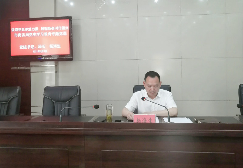 为推动党史学习教育走深走实,将党史学习与商务工作深度融合,引领党员干部践行“我为群众办实事”,6月3日,市商务局党组书记、局长杨海生为局机关党员干部作了题为《汲取党史厚重力量 展现商务时代担当》的专题党课,他从马克思主义为什么在中国行、中国共产党为什么能领导中国人民、中国特色社会主义进入新时代的新要求三个方面进行了深入浅出的讲解,让全局党员干部接受了一次深刻的思想教育和精神洗礼。