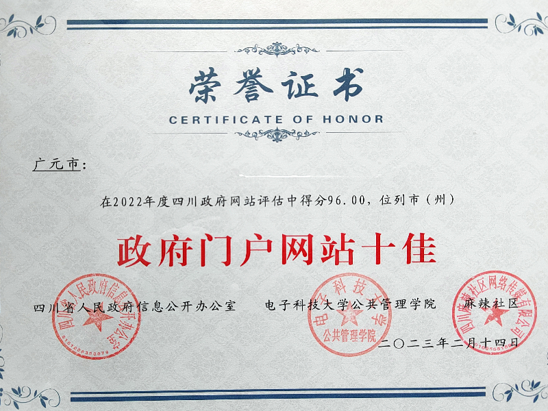 根据《评估报告》,在2022年度四川省政务公开中,广元得分91.65分,与雅安市、自贡市、泸州市同属积极发展类型;在2022年度四川省政府网站中,广元得分96分,与成都市、雅安市同属创新领先类型。“2022年全省各地各部门走好网上群众路线为民服务办实事优秀案例”共30个,是从全省各级各部门推荐的364个案例中遴选而出,具有较强代表性、创新性和可复制性,其中我市选送的《解决村民饮水难 提升群众获得感》成功入选。