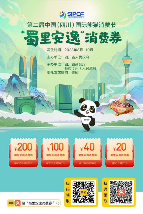为喜迎中秋、国庆“双节”到来,进一步释放消费潜力,营造消费氛围,四川将在中秋、国庆前夕继续发放第二届中国(四川)国际熊猫消费节“蜀里安逸”政府消费券。
