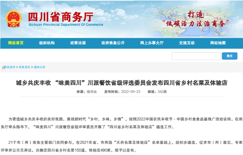 日前,四川省商务厅指导“味美四川”川派餐饮省级评审委员会在全省范围内开展了“四川省乡村名菜及体验店”遴选工作,最终认定四川省乡村名菜150道和490家体验店名单