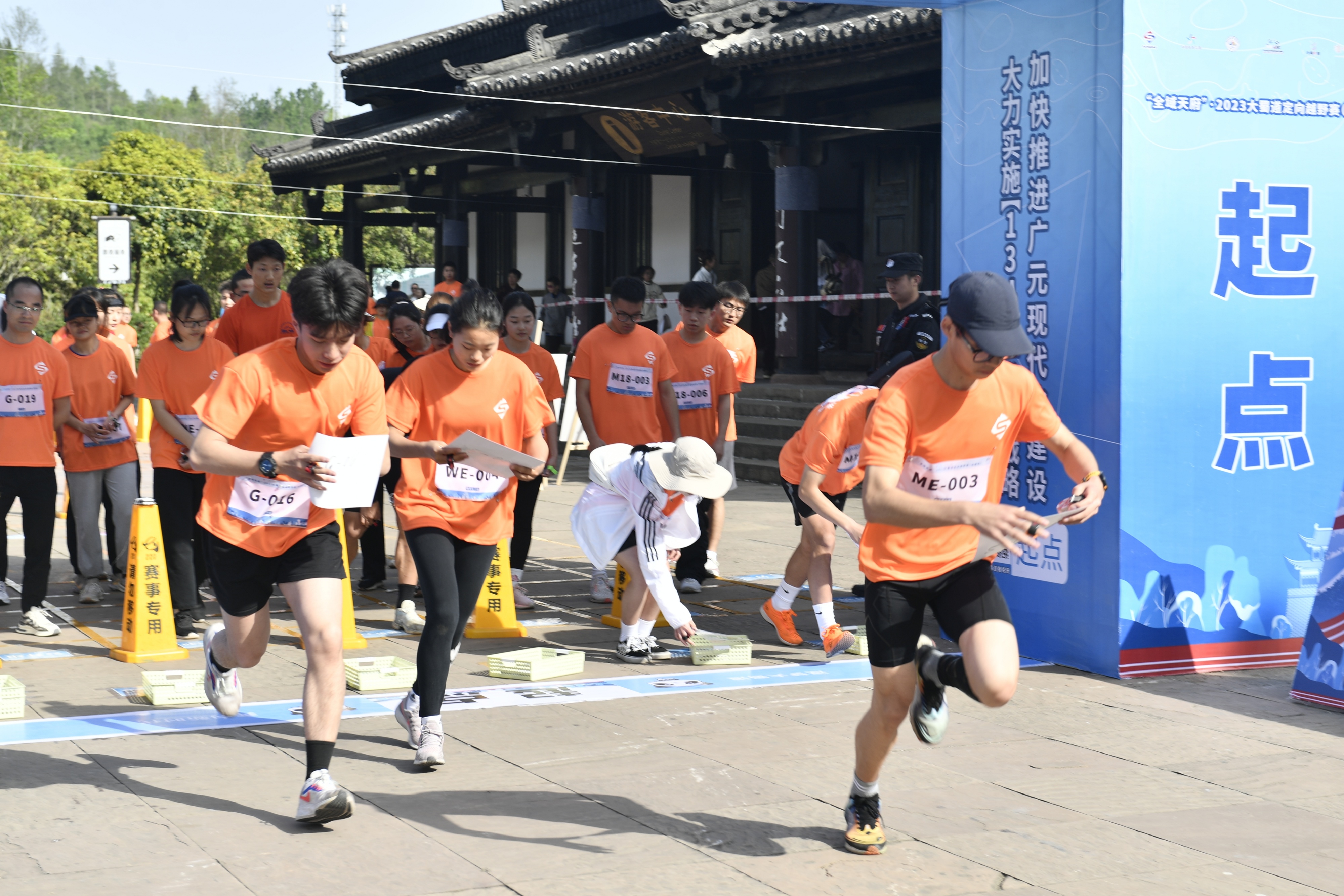 4月15日上午,“全域天府”·2023大蜀道定向越野赛(剑阁站)在剑门关景区鸣枪开赛。