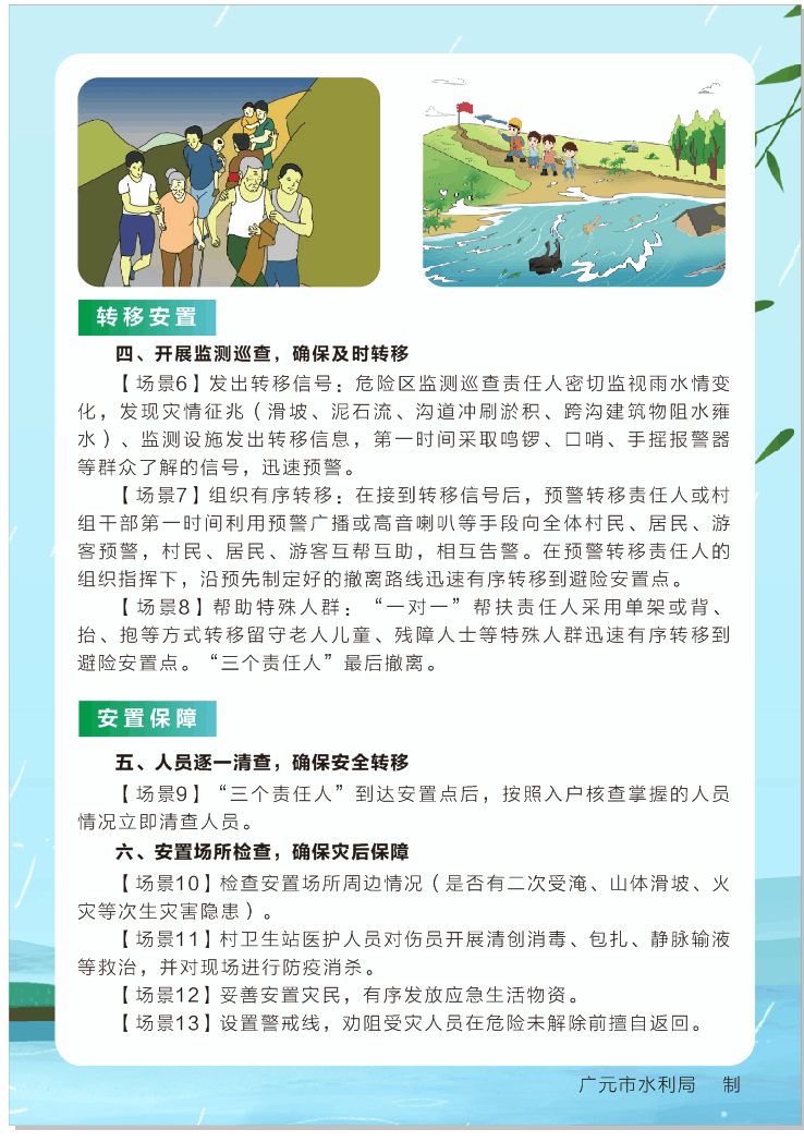 为有效指导山洪灾害危险区防灾避灾演练,提高山洪灾害危险区预案的实战性、可操作性,广元市水利局向全市1440个山洪灾害危险区统一印发了《广元市山洪灾害危险区临灾避险“六查六确保”演练脚本》(以下简称演练脚本),同时要求每个山洪灾害危险区要按照《演练脚本》开展1次应景式、实战化的夜间实战演练。