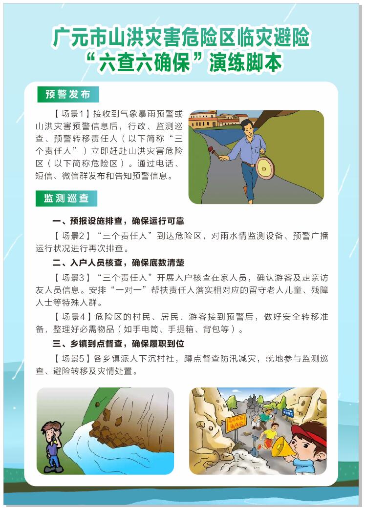 《演练脚本》结合广元地形地貌的防灾避灾特点,充分考虑夜间和“断路、断电、断网”等极端条件影响以及灾害叠加、桥涵堵塞等多种不利工况同时发生的极端情况,要求每一个山洪灾害危险区演练和实战时做到“六查六确保”:一是预报设施排查,确保运行可靠;二是入户人员核查,确保底数清楚;三是乡镇到点督查,确保履职到位;四是开展监测巡查,确保及时转移;五是人员逐一清查,确保安全转移;六是安置场所检查,确保灾后保障。
