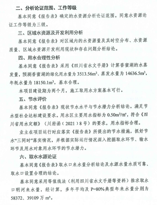 一、和信·凤凰世纪城·香蜜湖取水工程符合国家产业政策。四川水方工程勘测设计有限公司编制的《和信·凤凰世纪城·香蜜湖取水工程水资源论证表》(以下简称《论证表》)基本符合水资源论证表编制要求,取水、用水影响分析评价合理,结论基本可行。《论证表》可以作为取水申请的技术依据。