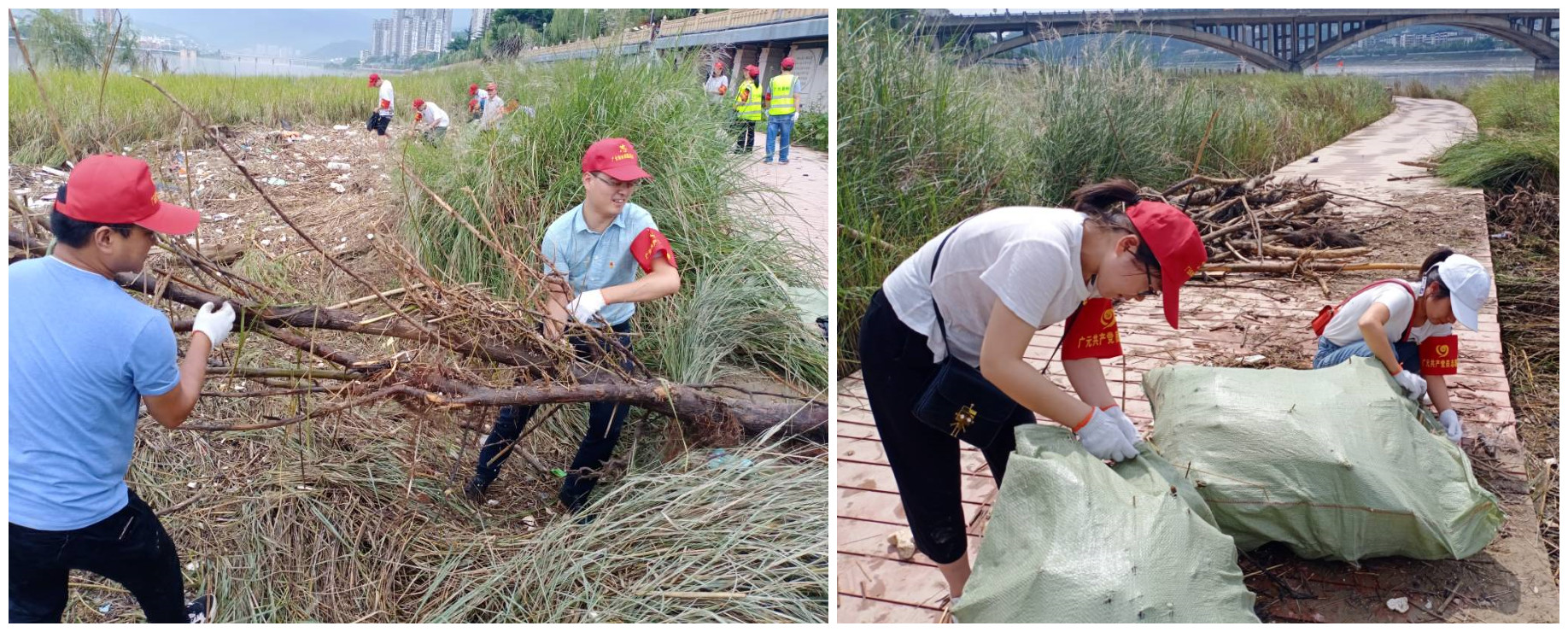 活动中,全体党员戴党徽、树形象、当先锋,充分发扬不怕脏、不怕累、不怕苦的实干精神,通过手捡、肩扛、锹铲,将大量洪水冲刷堆积的白色垃圾、断枝、杂物等装袋运送到指定垃圾堆放地点。