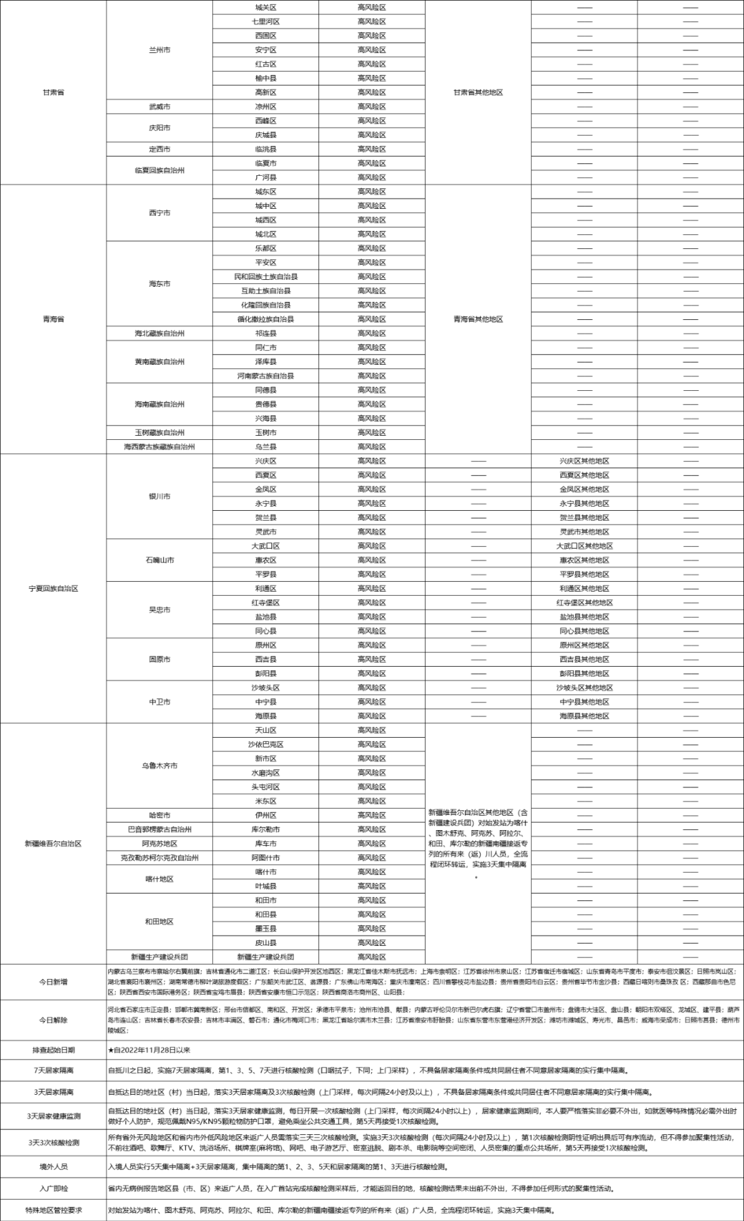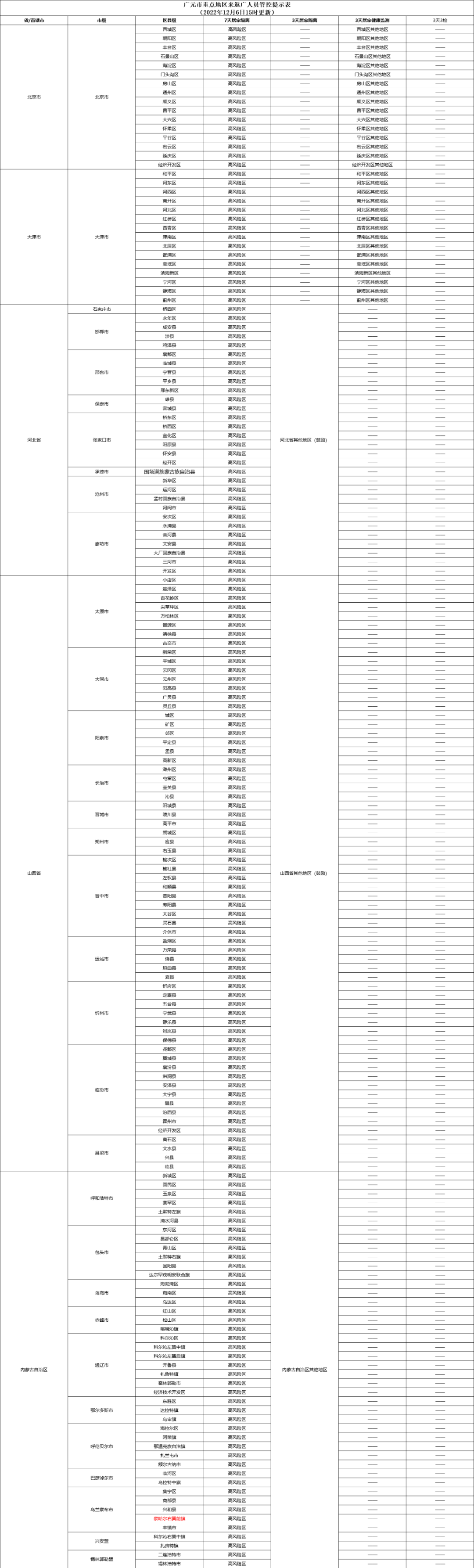 2、从西藏自治区除高风险区外的其他地区、内蒙古自治区除高风险区外的其他地区、甘肃省除高风险区外的其他地区、青海省除高风险区外的其他地区的来返广人员:自抵达目的地社区(村)当日起,实施3天居家隔离,在居家隔离结束后,要鼓励其再落实5天严格居家健康监测。3天居家隔离期间要配合每日上门核酸采样,共同居住者及其本人不得外出,拒绝一切探访。5天居家健康监测期间,非必要不外出、不聚集。