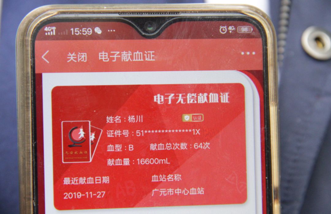 如愿完成献血后,杨川还收到另外一个惊喜,市中心血站为他签发了首张“电子无偿献血证”。现在,广元市所有无偿献血者,均可通过“爱献血APP”查询到自己的“电子无偿献血证”。![]()
