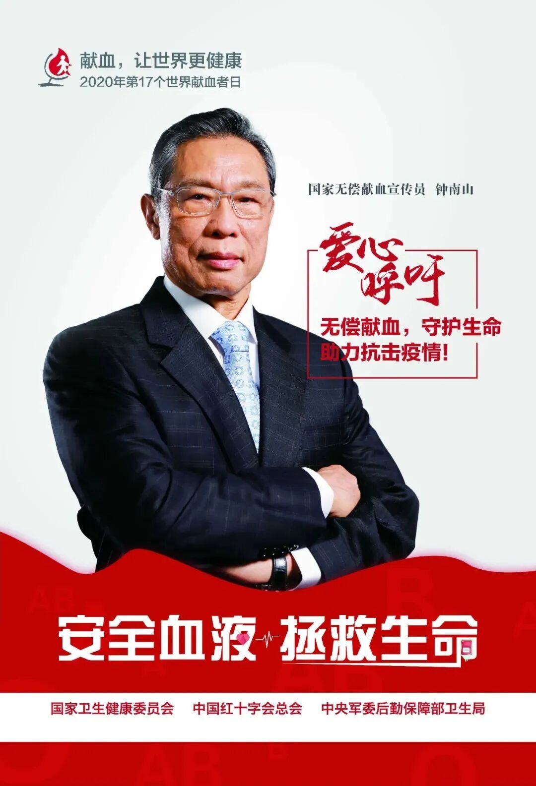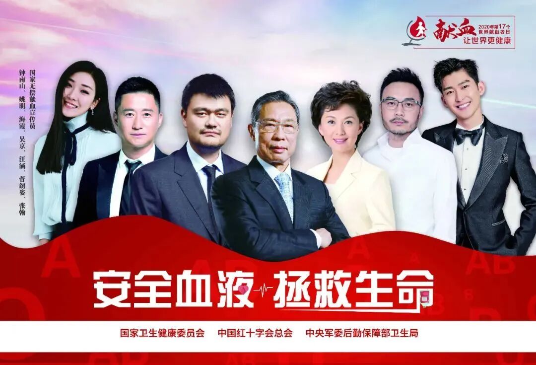 主海报形象代言人为钟南山、姚明、海霞、吴京、汪涵、菅纫姿、张翰,系列海报分别为钟南山、姚明、献血者和血站抗疫工作人员。