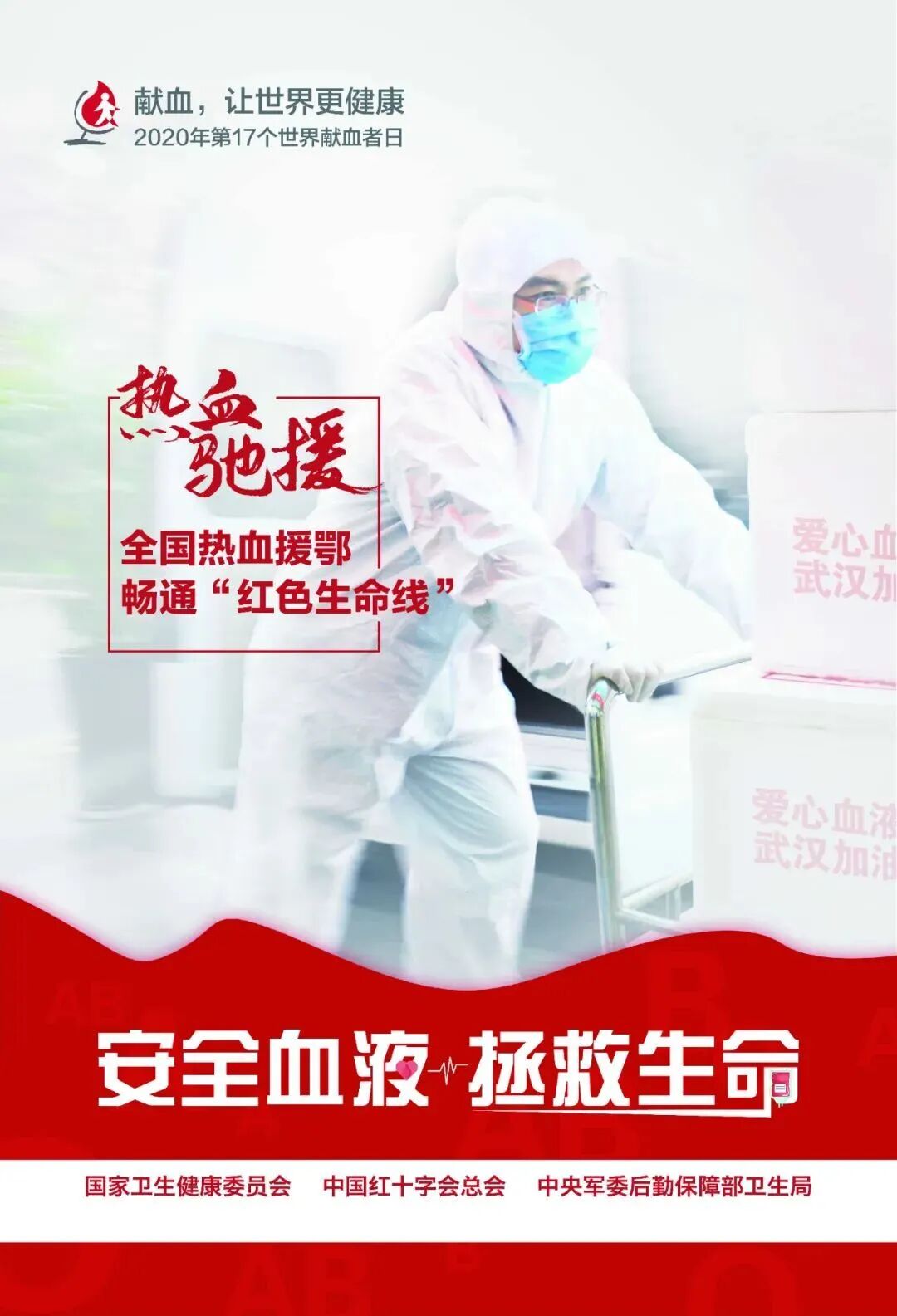 为指导各地做好世界献血者日宣传工作,营造有利于无偿献血健康发展的良好社会氛围,致敬无偿献血者,国家卫生健康委、中国红十字会总会和中央军委后勤保障部卫生局联合发布2020年世界献血者日宣传海报。宣传海报共5张,包括主海报1张,系列海报4张。