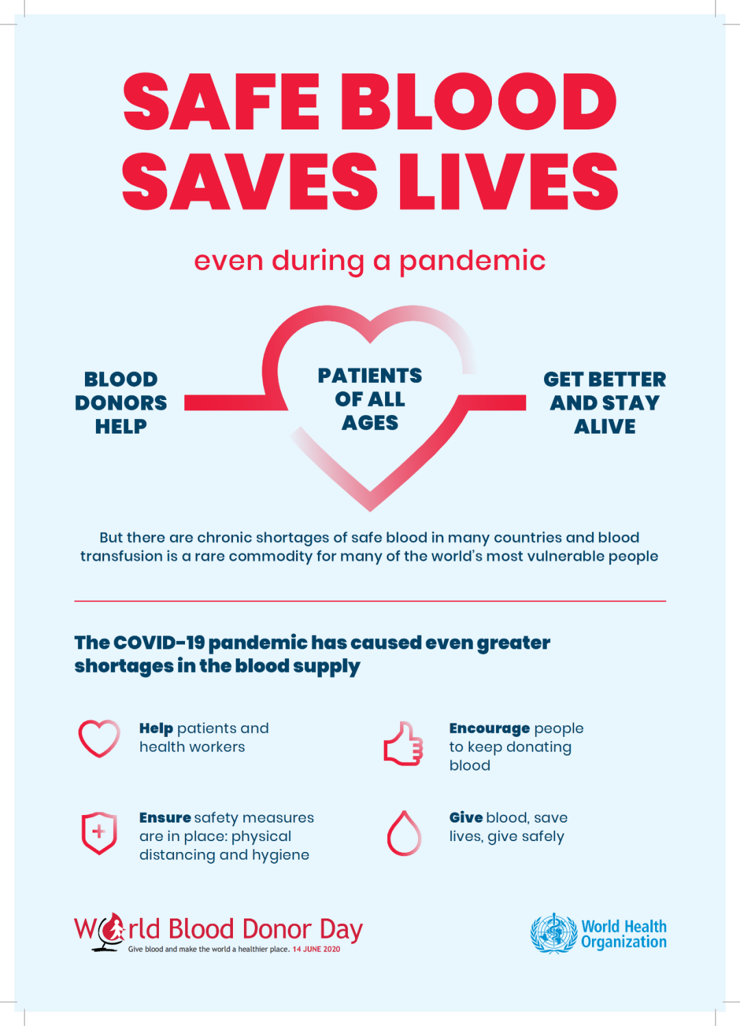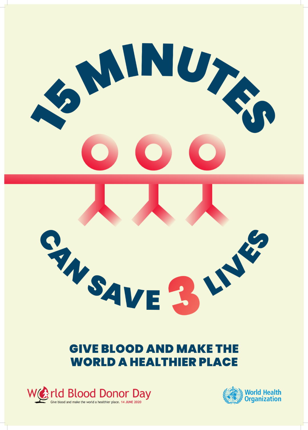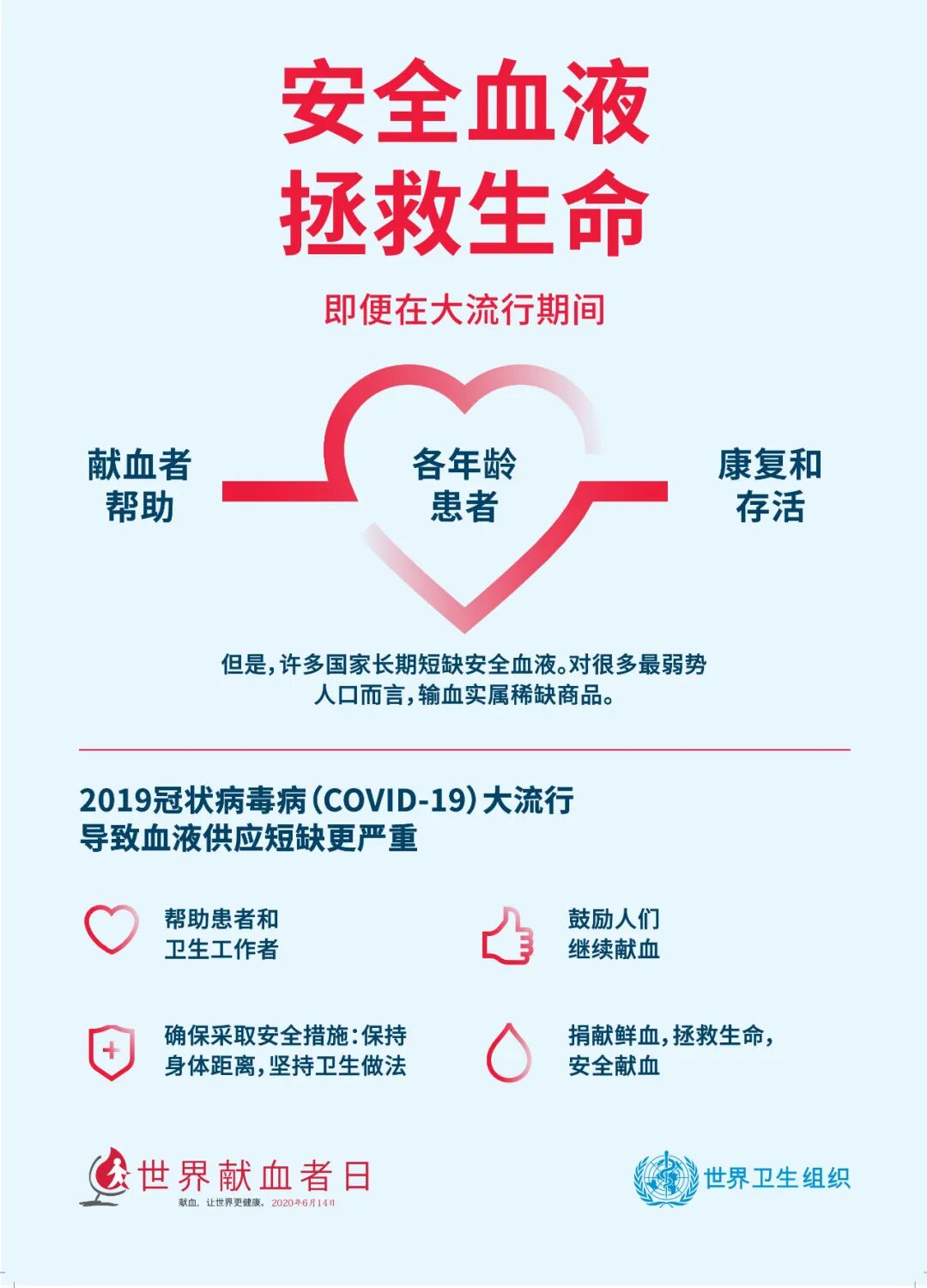6月4日,世界卫生组织(WHO)发布了2020年世界献血者日(WBDD)海报和媒体宣传材料。材料以WHO的六种官方语言(中文、英语、法语、俄语、西班牙语和阿拉伯语)发布。