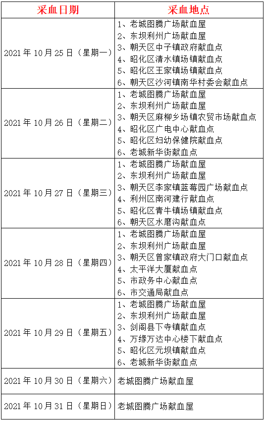 无偿献血地点指引(10月25日—10月31日)