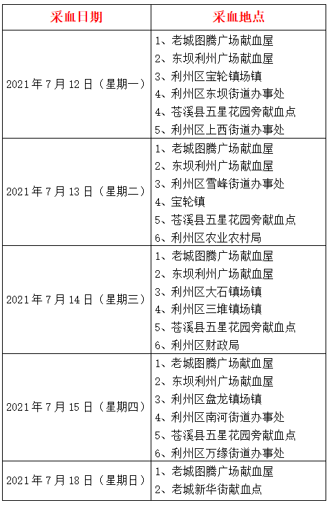 无偿献血地点指引(7月12日—7月18日)
