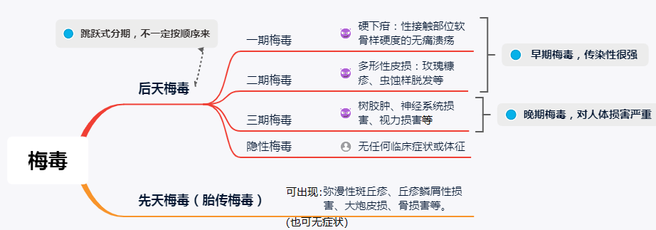 梅毒的诊断分期分为5种,其中一、二、三期梅毒有相应的临床表现。