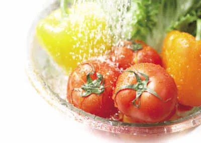 生吃瓜果蔬菜要洗净,先用清水浸泡,然后使用清洁水多次冲洗,一些带叶、带根的蔬菜,要特别注意根部的清洗,葡萄、草莓等水果在冲洗的过程中,用手轻轻地洗刷表面。![]()