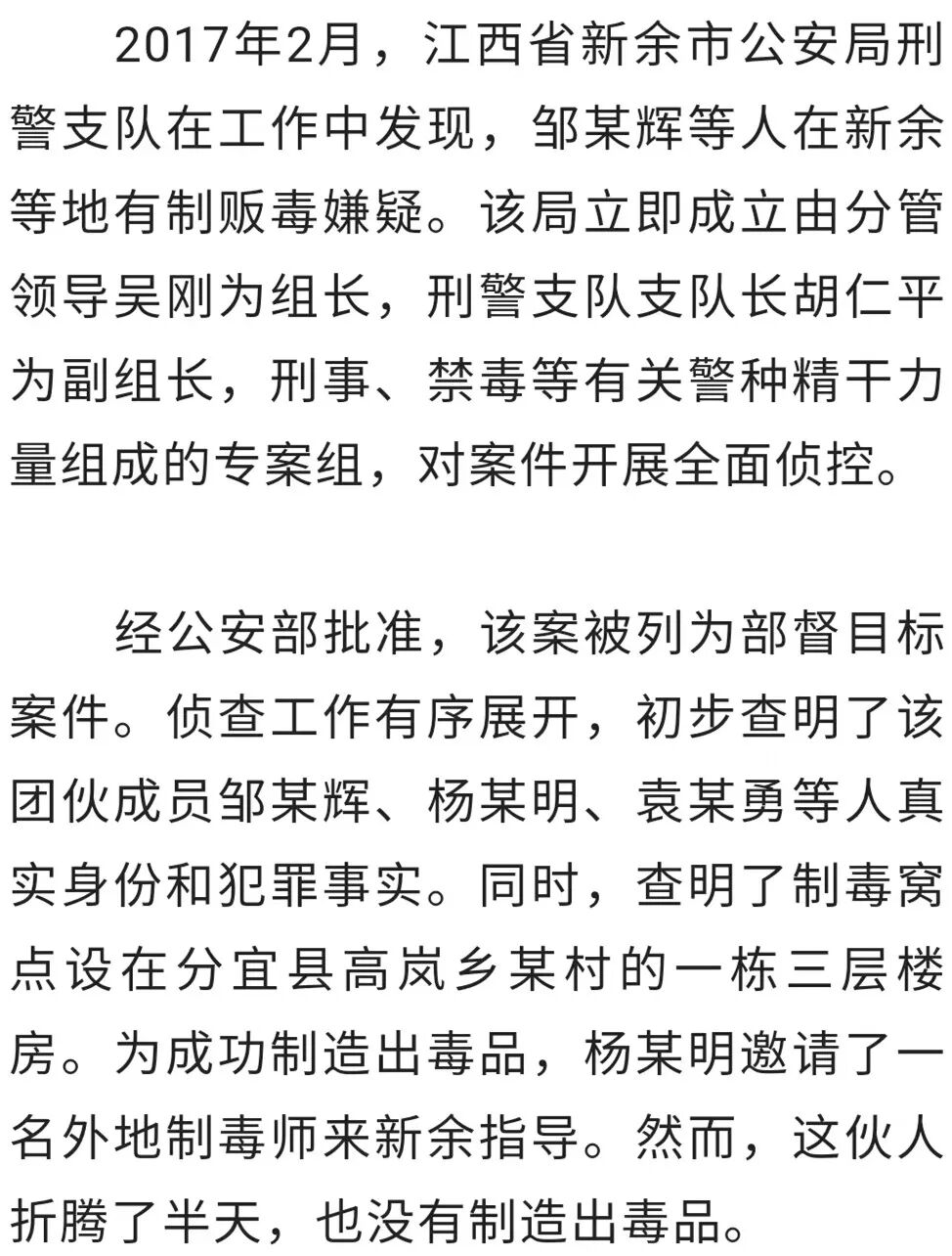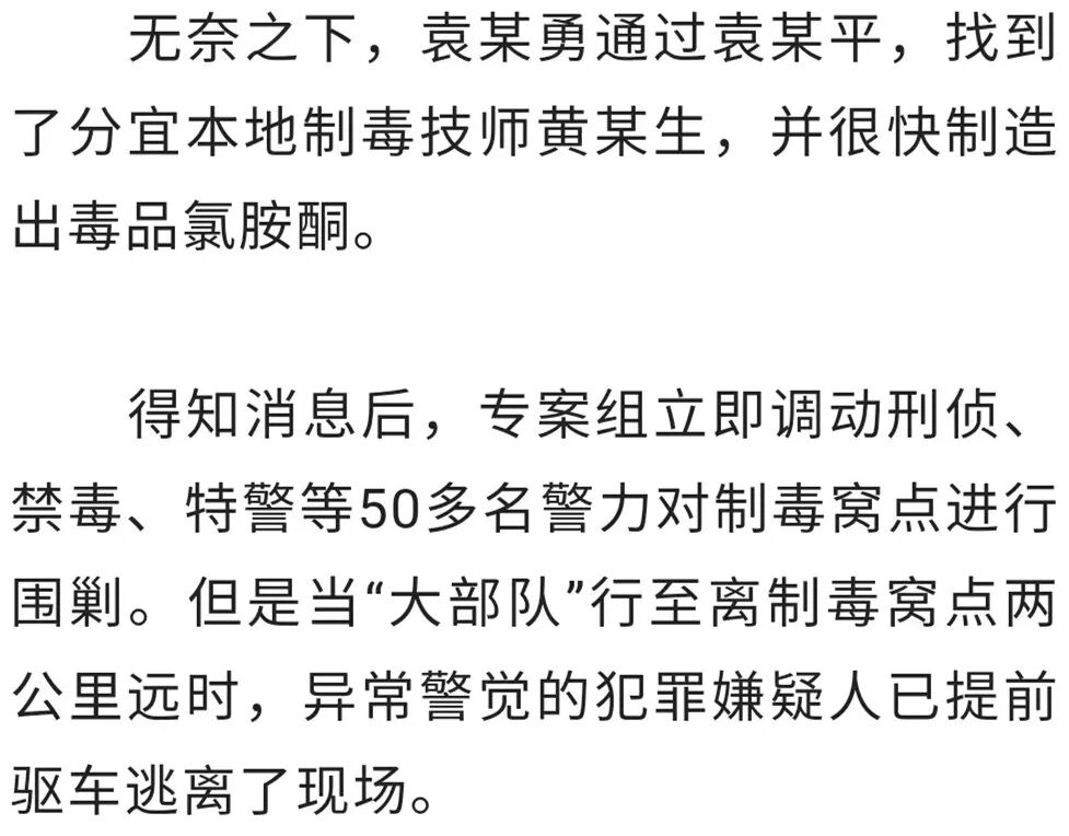 “我们把车开到半山腰,因为山路特别难走,小车无法前进,就下车往山上冲。”一位办案民警回忆称。围捕工作惊动了正在制毒的人员,制毒人员在黑夜的掩护下,纷纷钻进树林往山下跑。专案组组织四个小分队及时冲上大皇山顶,控制住了制毒窝点,并成功抓获杨某明。随后,在山下设卡的民警一举将犯罪嫌疑人袁某勇等8人抓获。犯罪嫌疑人袁某平、黄某生等侥幸逃脱。但在新余警方布下的天罗地网中,袁某平等4人在湖南浏阳被抓获。
