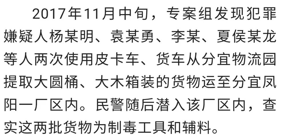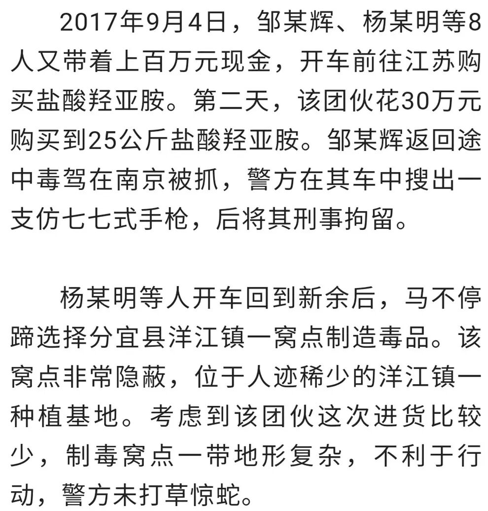 2017年12月19日凌晨4时许,该团伙驾驶4辆车先后回到分宜。专案组派遣一支小分队驱车先行前往分宜侦查,发现一辆货车将制毒辅料及工具装运至洋江镇,制毒师黄某生在洋江集镇购买了洗衣机等物品后,前往洋江镇某种植基地。当晚11时许,侦查人员潜入种植基地的房子内闻到浓烈的刺鼻味,初步分析此处为制毒窝点。