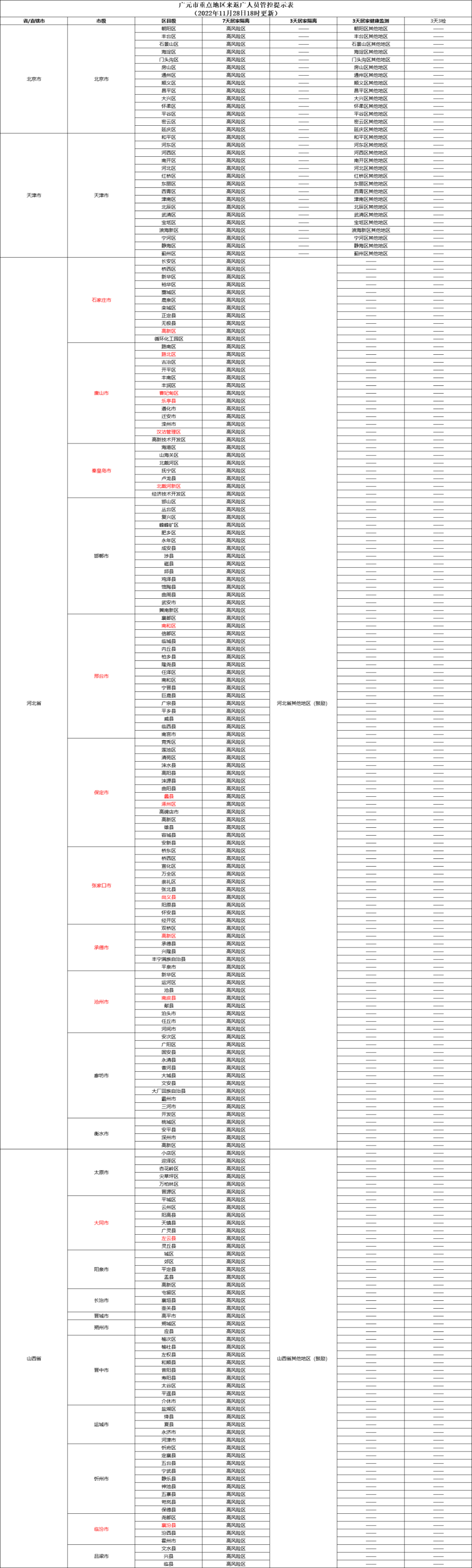 近期,国内疫情呈现“点多、面广、频发”的特点,防控形势更加严峻复杂。公众要密切关注广东省广州市、佛山市,重庆市,北京市朝阳区,山西省忻州市、太原市、朔州市,新疆维吾尔自治区喀什市、和田市、乌鲁木齐市,河北省石家庄市,甘肃省兰州市,山东省济南市,陕西省榆林市、西安市,青海省西宁市,河南省郑州市,内蒙古自治区呼和浩特市,湖北省武汉市,广西壮族自治区桂林市等地疫情动态。所有来(返)广人员,在入广前,要主动向目的地所在社区(村)报备,并积极配合落实相关疫情防控措施。