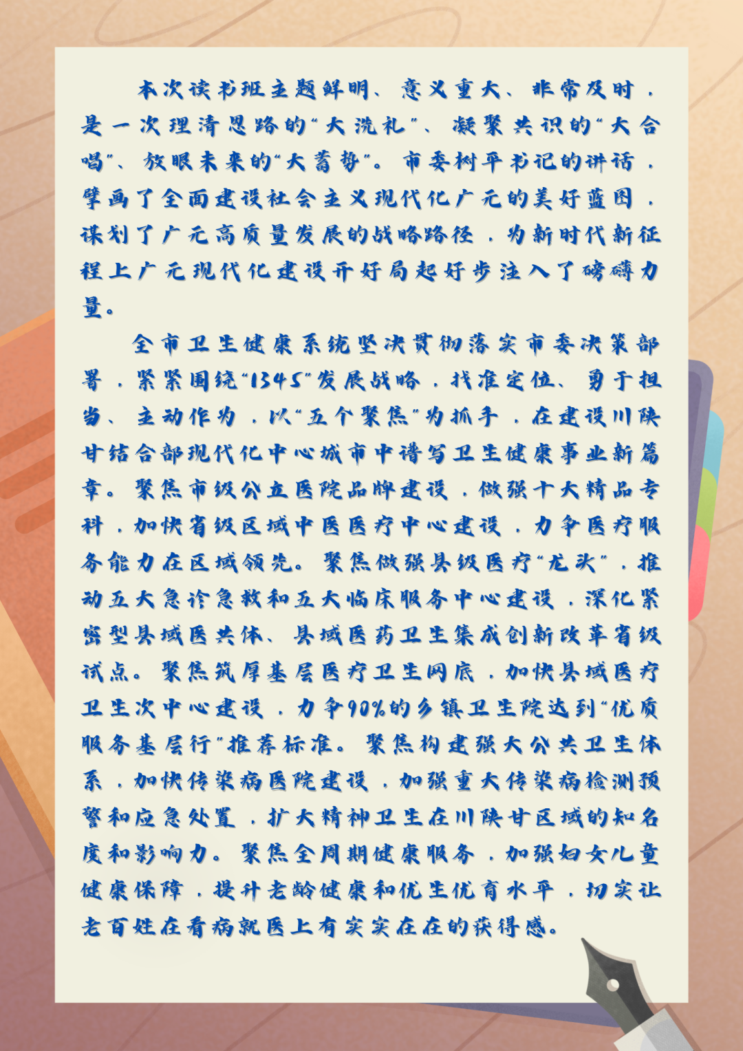 3月21日至23日,市级领导干部和县级主要负责同志读书班在广元举行。市委、市人大常委会、市政府、市政协领导,市法院院长、市检察院检察长,各县(区)党委政府、市级各部门(单位)主要负责同志等参加读书班。 读书班期间,学员们认真学习、相互交流。大家有哪些所思所谋,透过他们“写”下的学习笔记,我们一起来看看吧↓↓