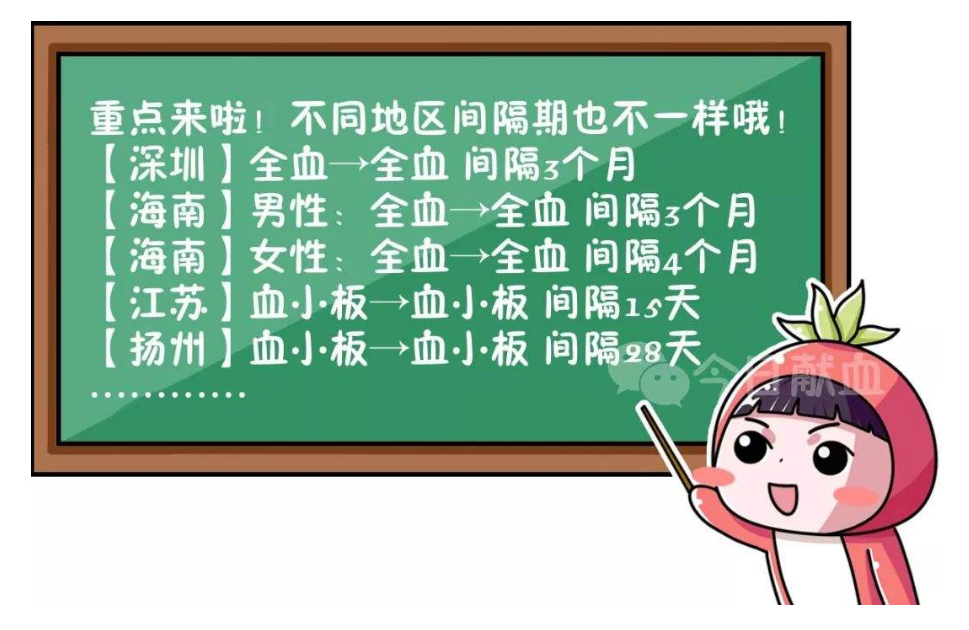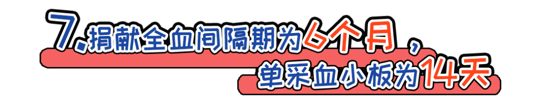 捐献全血的间隔期为6个月;捐献单采血小板的间隔期为14天;捐献全血后捐献单采血小板的间隔期为3个月;捐献单采血小板后捐献全血的间隔期为1个月。
