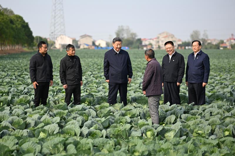 5日上午,习近平前往咸宁市嘉鱼县,首先到潘家湾镇十里蔬菜长廊考察。深秋时节,这里仍然满目青翠、生机勃勃。习近平走进田间,察看蔬菜长势,详细询问蔬菜品种、种植技术、销售等情况。他强调,农村天地广阔,农业大有可为。发展现代农业,建设农业强国,必须依靠科技进步,让科技为农业现代化插上腾飞的翅膀。他勉励当地干部群众走科技之路、质量之路、品牌之路,把蔬菜种植这个富民产业进一步做好,让更多群众增收致富。