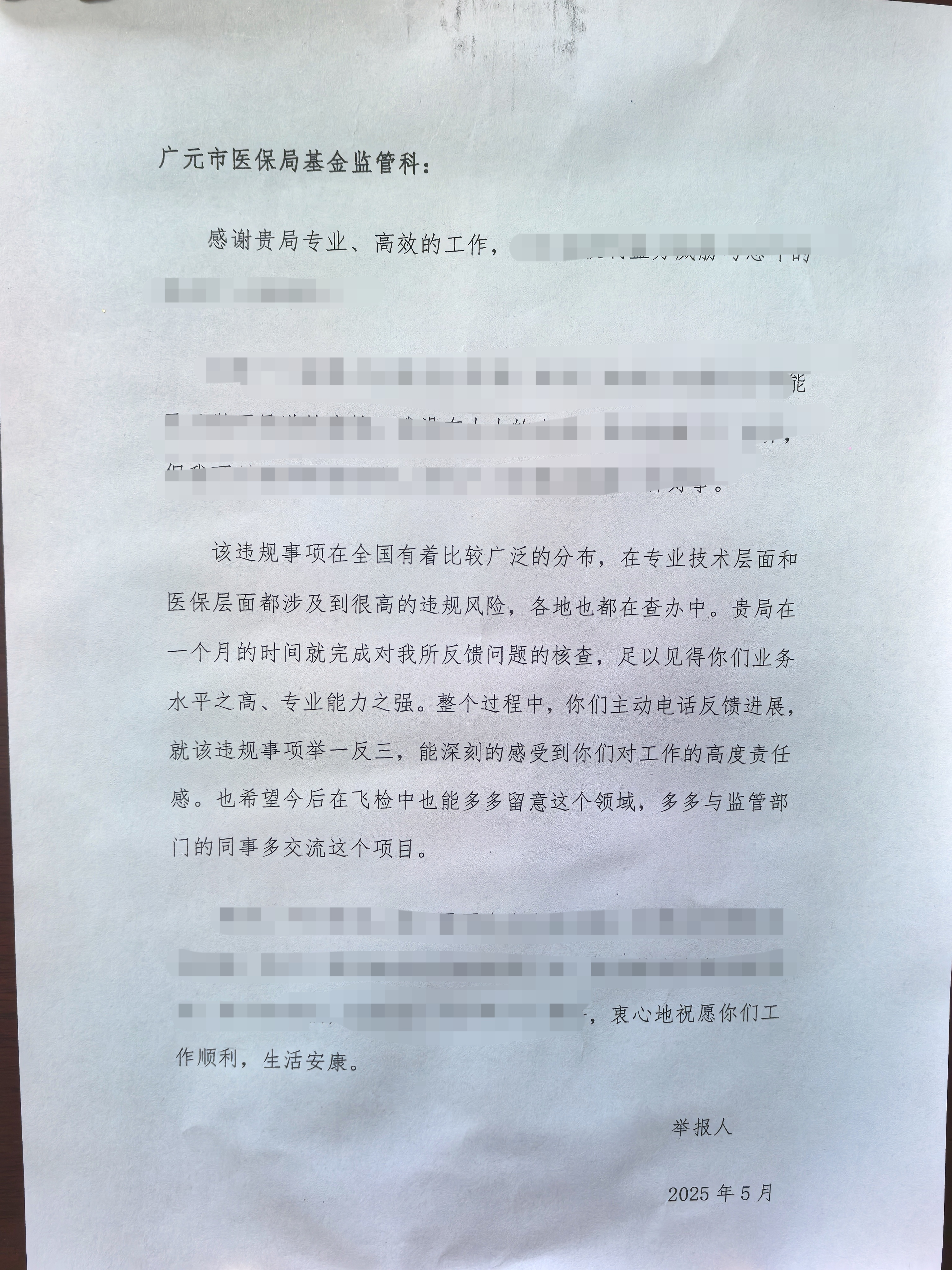 医保基金是群众的“看病钱”“救命钱”,为切实守护医保基金安全,近日,市医保局通过官微、官网、电视等多渠道征集违法违规使用医保基金线索,对群众举报核查属实的违规问题,依法依规从严从重从快处理,并对举报人给予奖励。3月下旬,一名群众提供了违规使用医保基金问题线索,全市医保系统高度重视、立即行动,通过大数据比对、现场核查、走访询问等方式,市、县(区)联动核查数据6896条,查实违规医疗费用62.98万元,追回医保基金47.95万元。