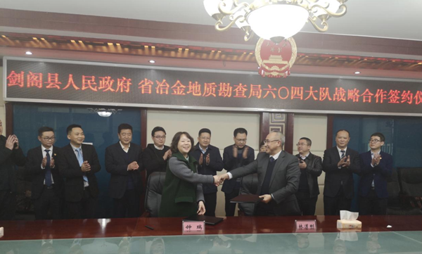 3月13日,剑阁县人民政府与四川省冶金地质勘查局六零四大队在剑阁县签署了地质灾害防治“一对一”战略合作协议。四川省冶金地质勘查局党委常委、副局长徐锡惠、六零四大队大队长林道刚、剑阁县县委常委、县委办主任花泽松出席、县政府副县长钟瑞主持签约仪式。林道刚和钟瑞作为双方代表签署了战略合作协议。