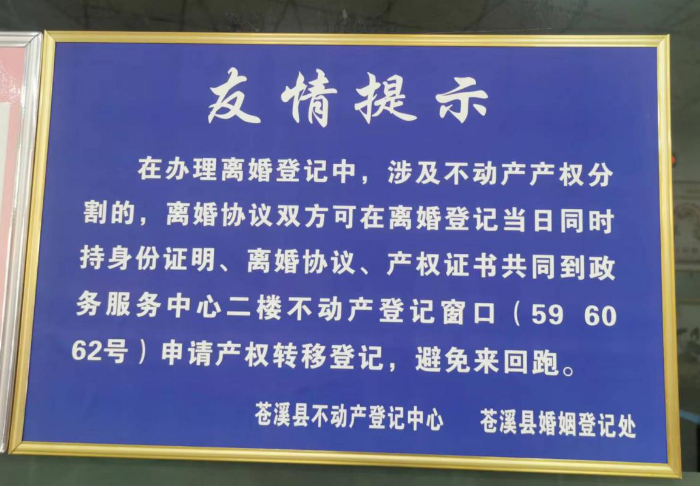 今年8月起,通过网络端口接入、数据资源共享等方式,苍溪县不动产登记中心与苍溪县婚姻登记处建立涉婚不动产转移登记“一窗受理、协同办理”机制。苍溪县婚姻登记处工作人员在办理夫妻离婚登记时,凡涉及到不动产产权分割的,由不动产登记人员进驻现场办理。截至8月22日,苍溪县不动产登记中心为8对离婚夫妻当日办结了涉婚不动产转移登记业务,助力打造川内最优营商环境,切实提升了办事群众的获得感和满意度。
