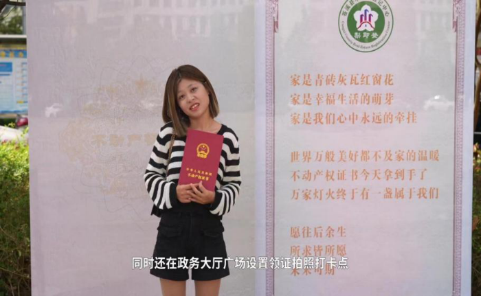 拍照打卡记录美好。为满足群众拿证的仪式感、自豪感,不动产登记中心在政务服务中心广场设置了“不动产权证书拍照打卡点”,该打卡点以别具特色的设计、暖心的布置和唯美的文案吸引了众多业主和购房者前来拍照打卡,记录拿证这一幸福开心的时刻。