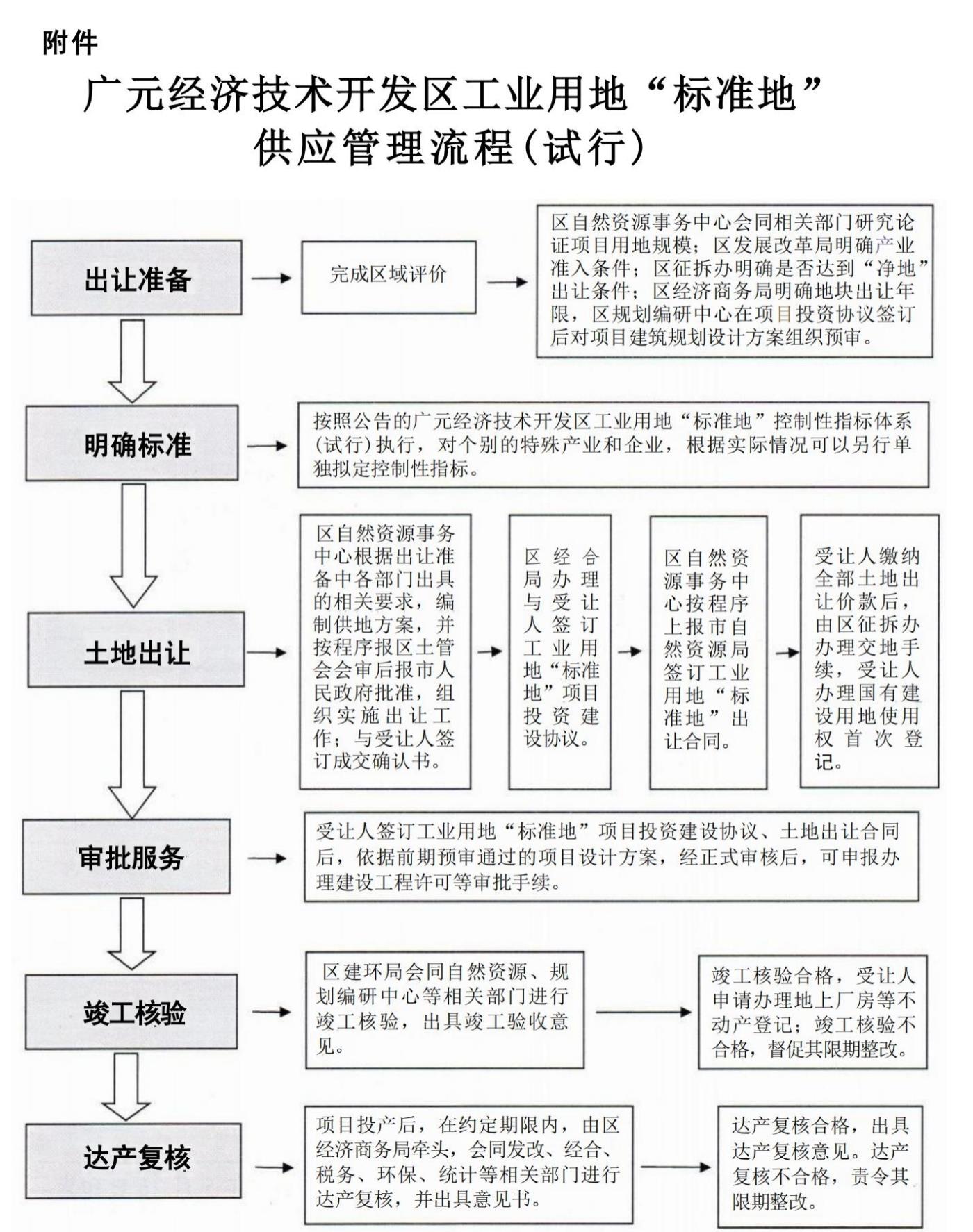 为进一步深化放管服改革,提高工业项目落地效率、土地产出效益,促进土地节约集约利用,根据《四川省人民政府办公厅关于推行工业用地“标准地”改革的通知》(川办发〔2021〕11号)、《广元市发展和改革委员会等14部门关于印发<广元市市本级工程建设项目告知承诺审批(服务)事项(第三版)>的通知》(广发改〔2023〕132号)、《广元经济技术开发区管理委员会办公室关于印发<广元经开区推行工业用地“标准地”供应制度改革工作方案>的通知》(广开管办〔2021〕29号),制定本流程,请遵照执行。